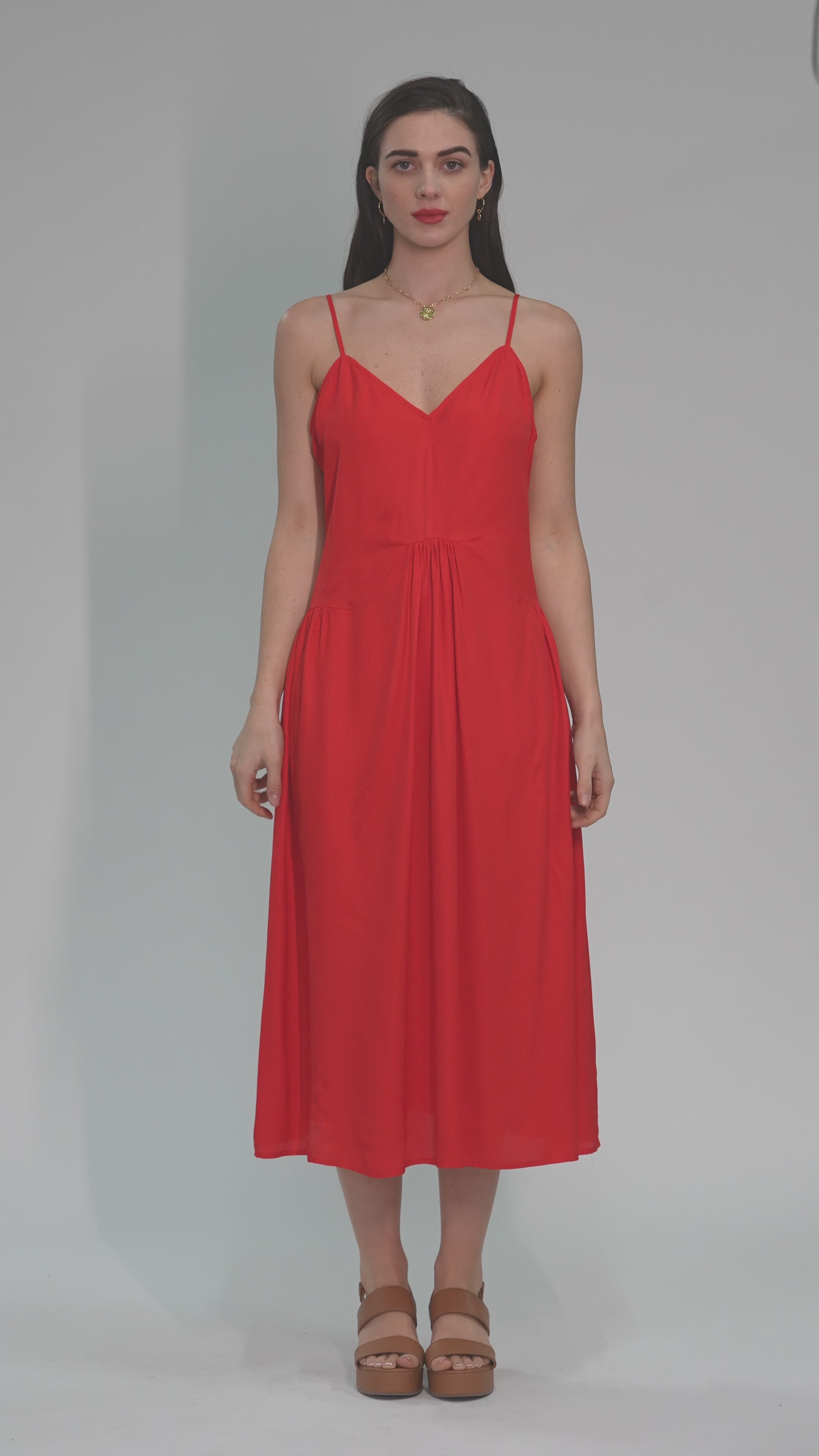 The Adeus Dress is a sleeveless, mid-length, relaxed fit style. This style offers gathered seams creating a soft volume at the waist and hip. Made in a flowy viscose fabrication.
