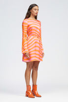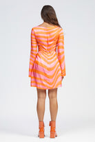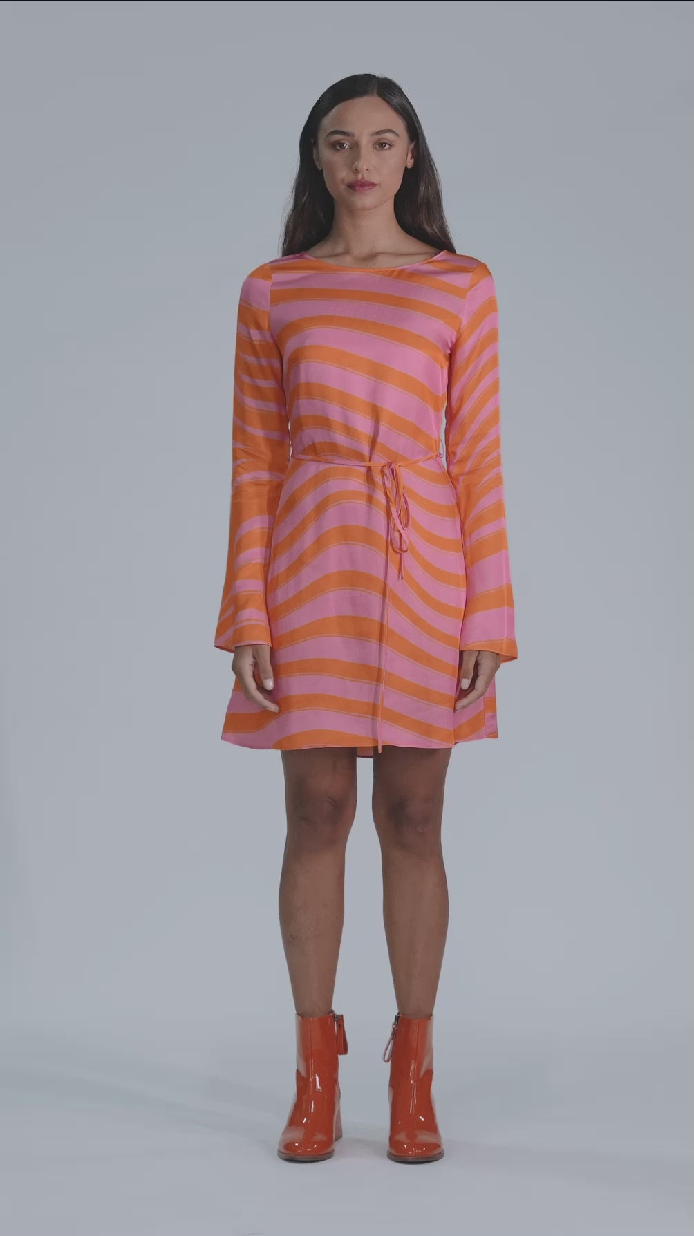 The Ceol Dress is a mini-length style with full-length flared sleeves. This style features a narrow self-fabric waist tie, a wide scooped neckline and an invisible zipper fastening at the centre back. Back darts provide a more tailored fit through the upper body and waist, flaring from the waist into a flowy skirt. Made in a smooth and silky Viscose with búl’s house-designed Squiggle Print.
