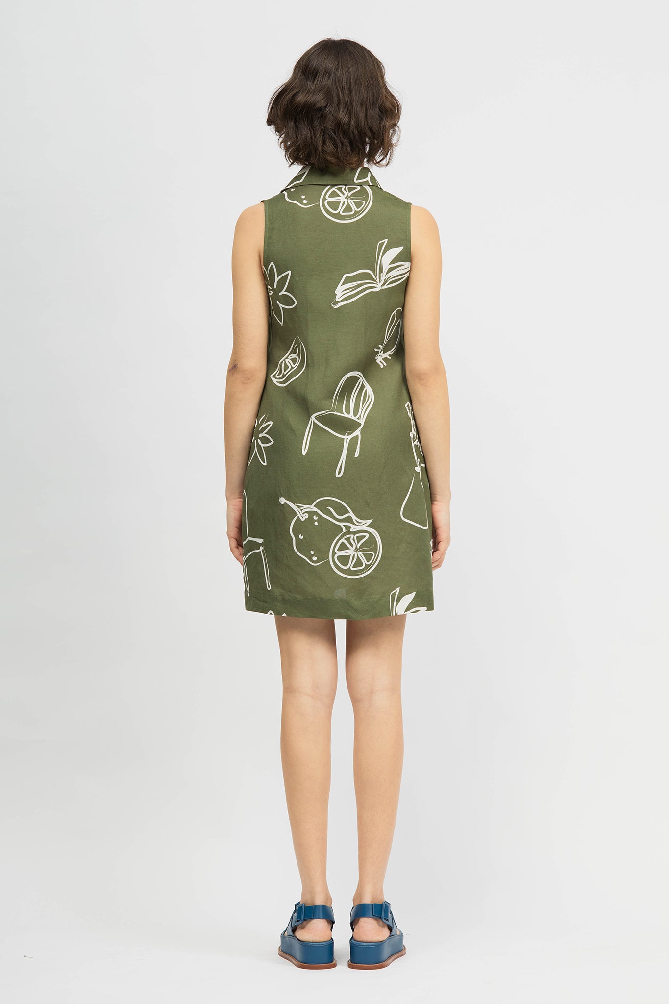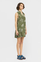 The Gicha Dress is an A-line, sleeveless, mini-length style in a relaxed fit. This style offers an open collar, V-neckline and inseam pockets. Made from a soft linen/ viscose blend in búl’s in-house designed Bom Print.