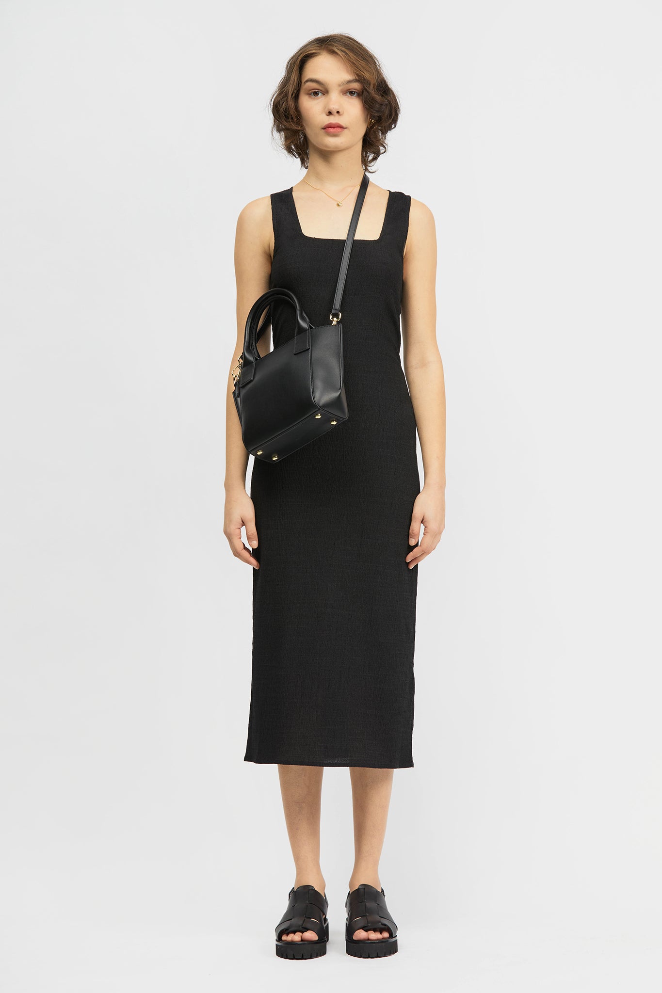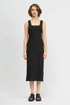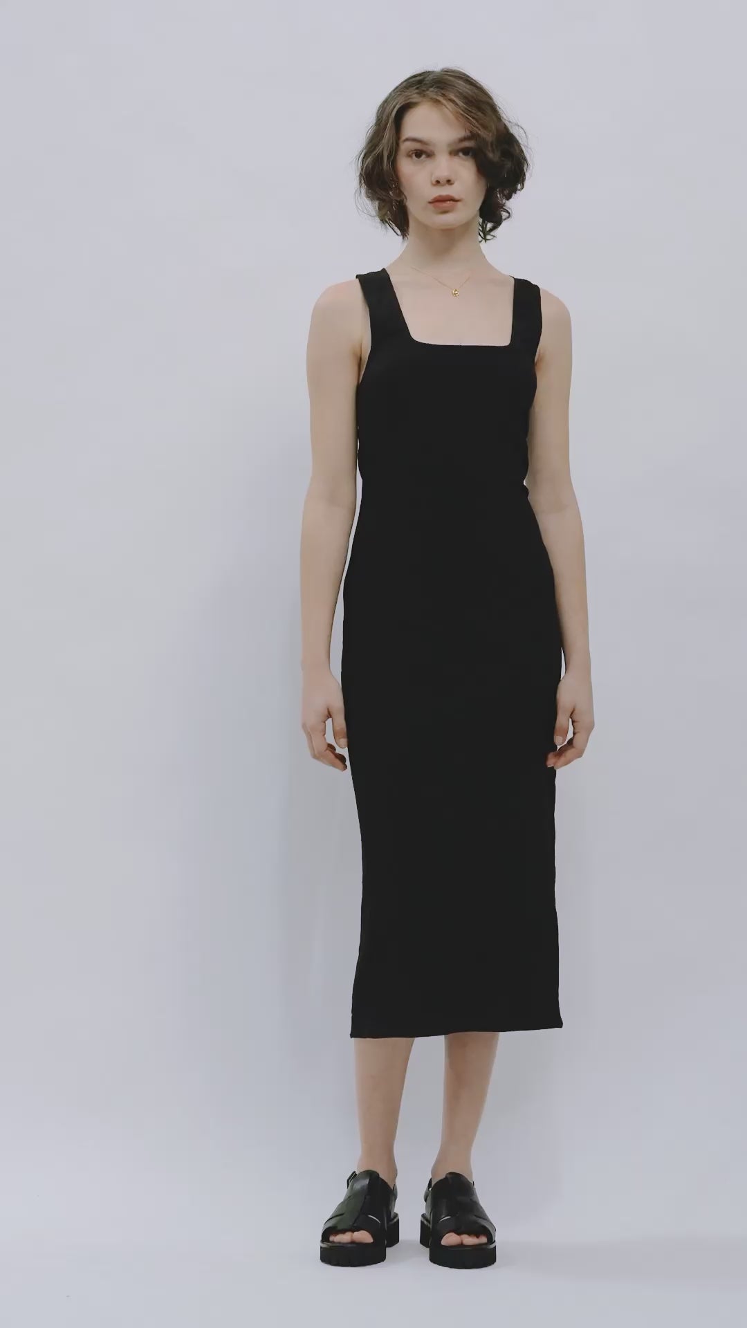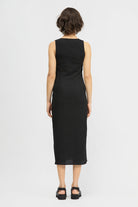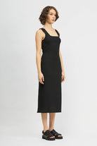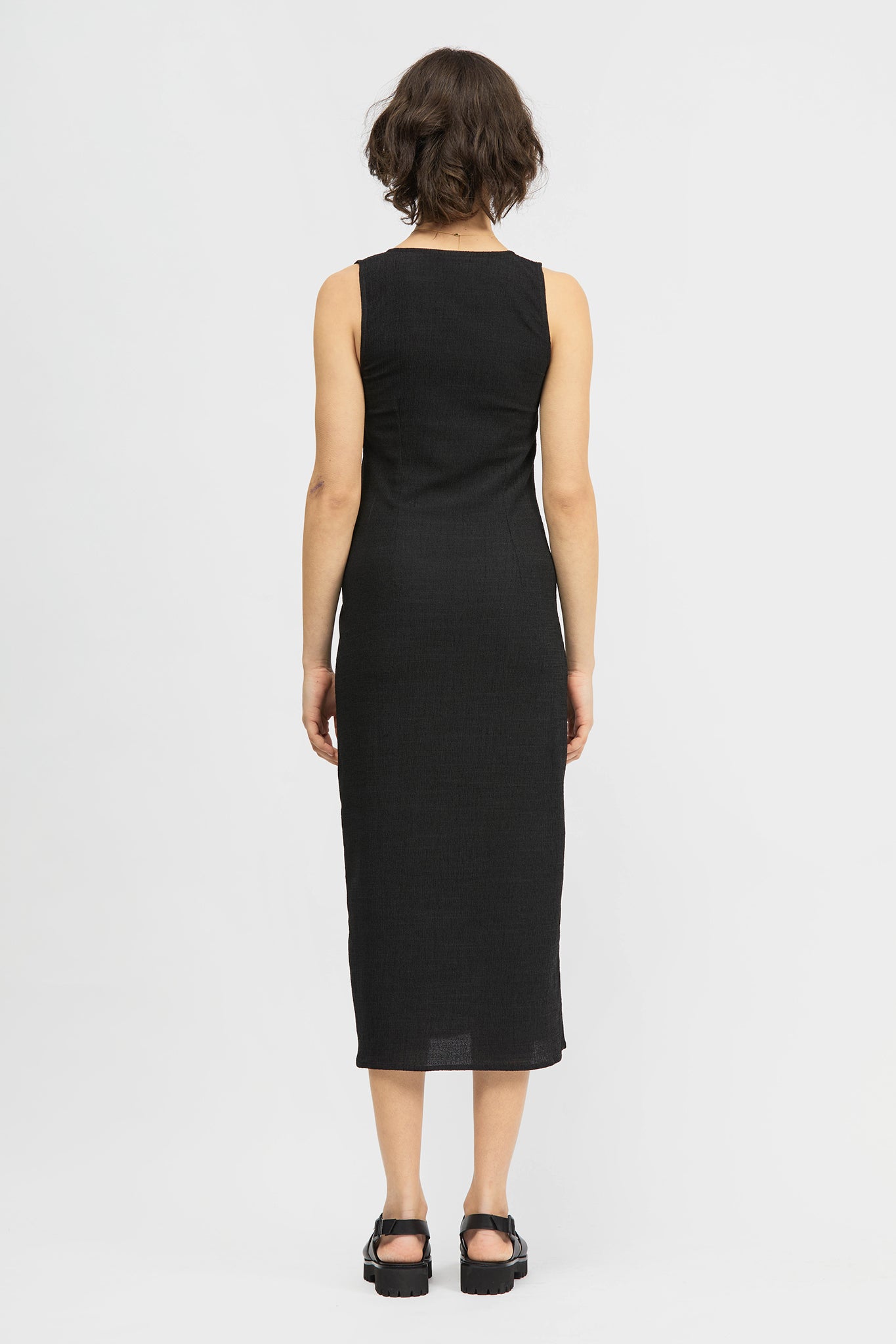 The Hae Dress is a sleeveless, mid-length, fitted style. This style includes a scooped neckline at front and dart detailing. Made from a stretch seersucker fabrication.