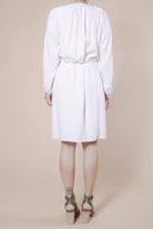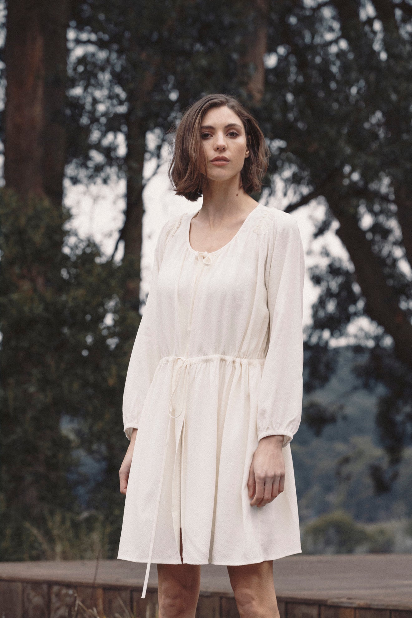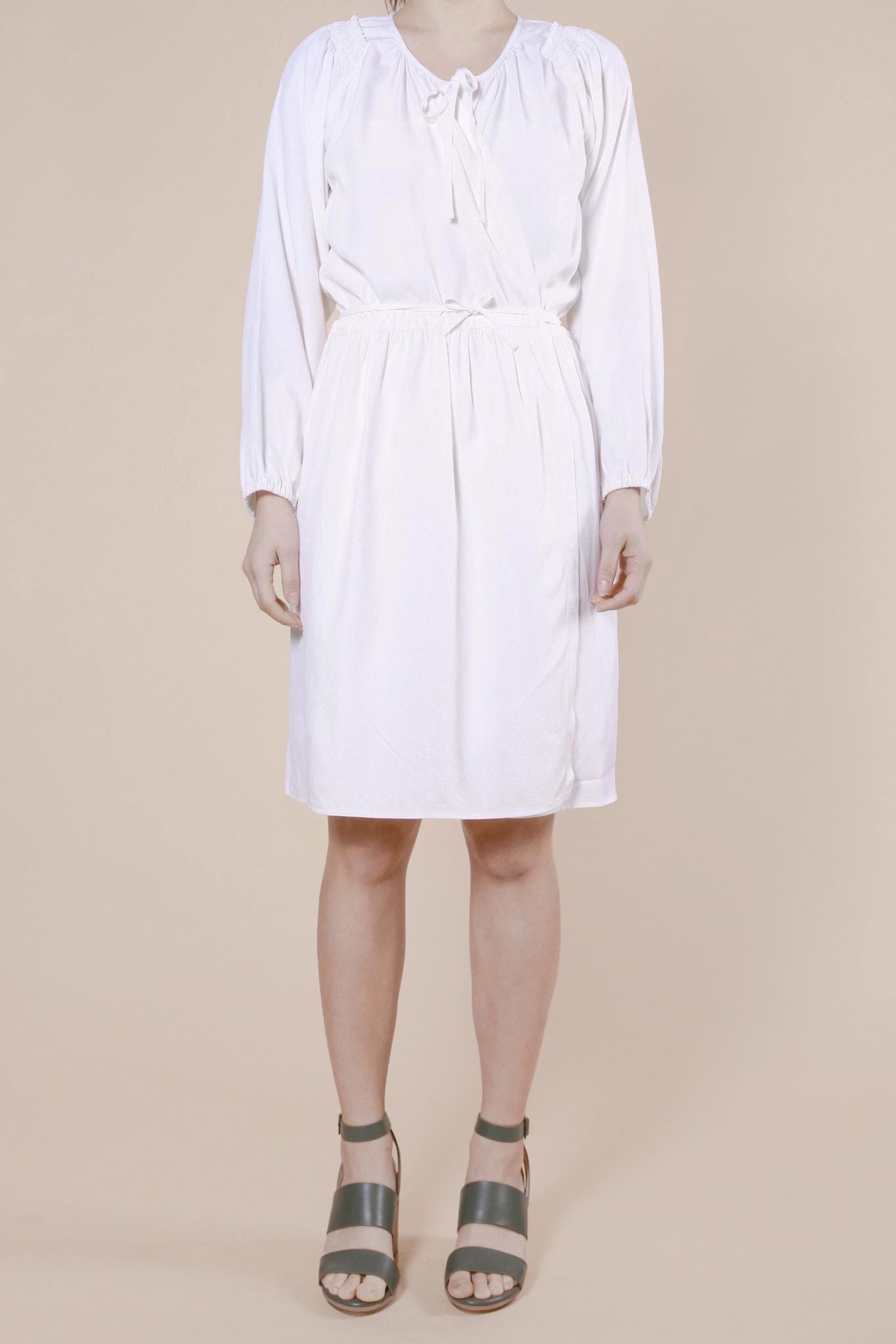 hihi is a wrap mini dress with frill details and a gathered waist line. this dress includes a mini slip dress to wear underneath the wrap.
