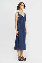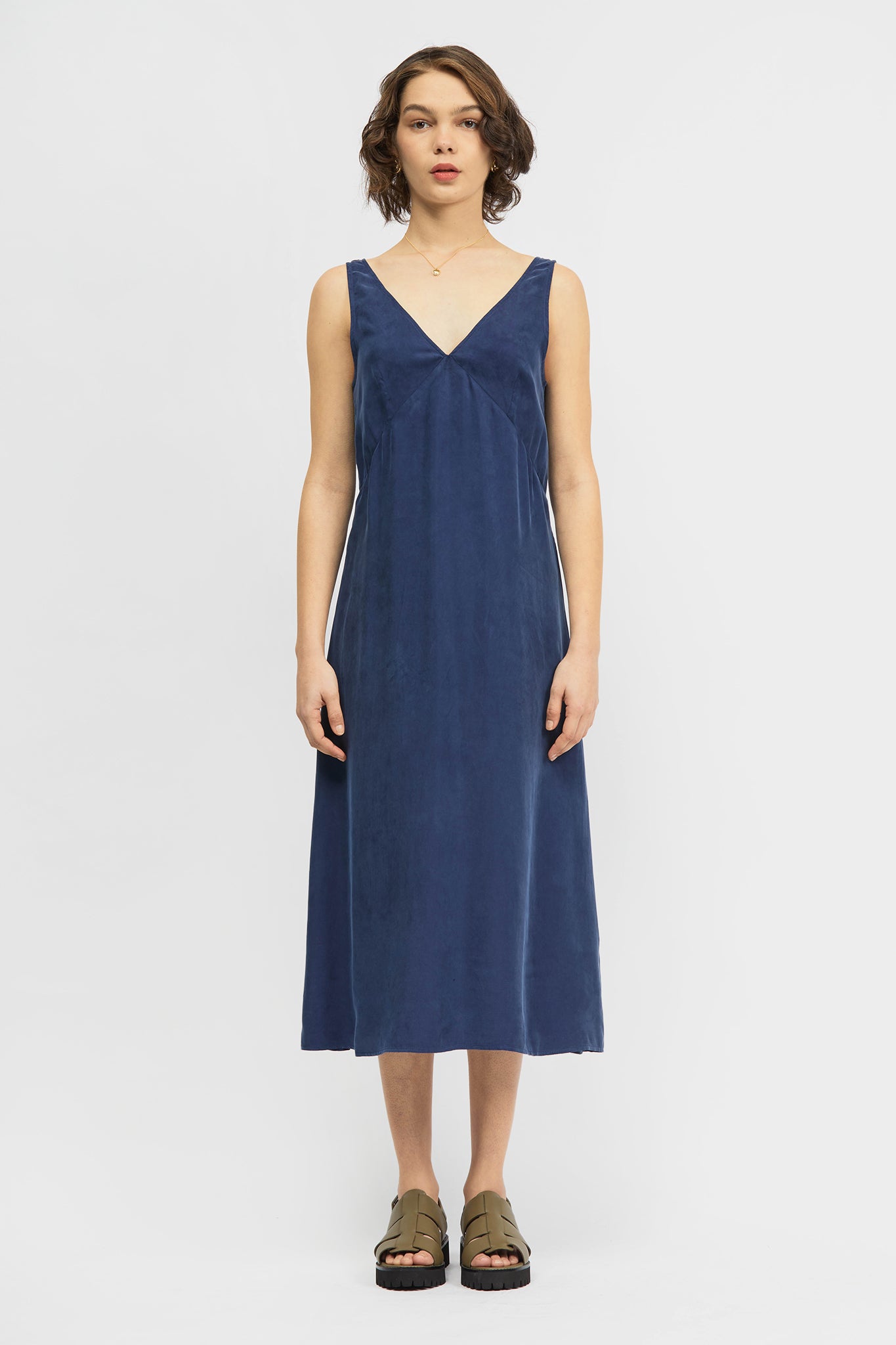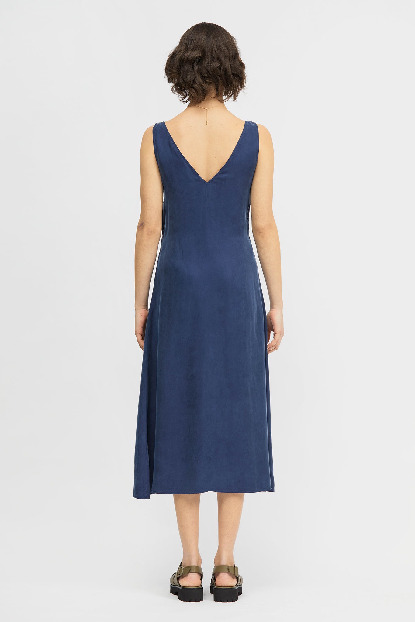 The Josu dress is a sleeveless, mid length style with an A-line silhouette and regular fit. Features include a V-neckline at the front and back and seam detailing around the bust. Made in a soft cupro blend.