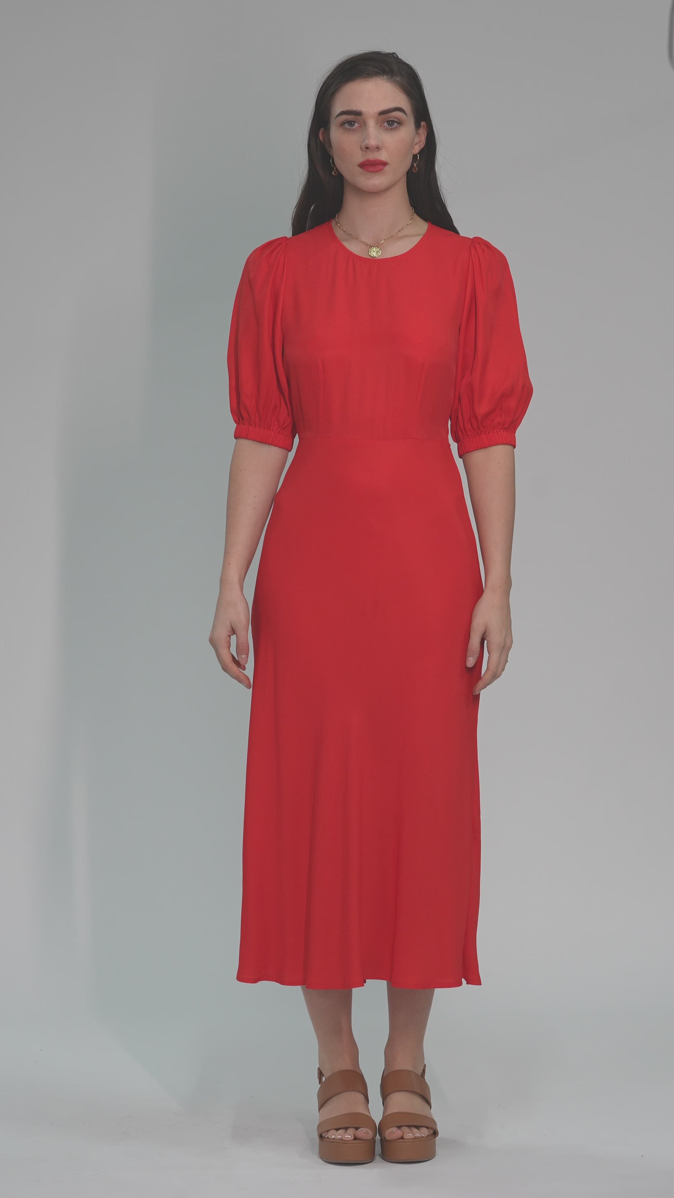 The Leo Midi Dress is an a-line, mid-length style, with a regular fit. This style includes voluminous short sleeves and dart detailing. Made in a flowy viscose fabrication.