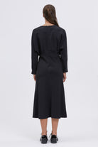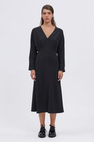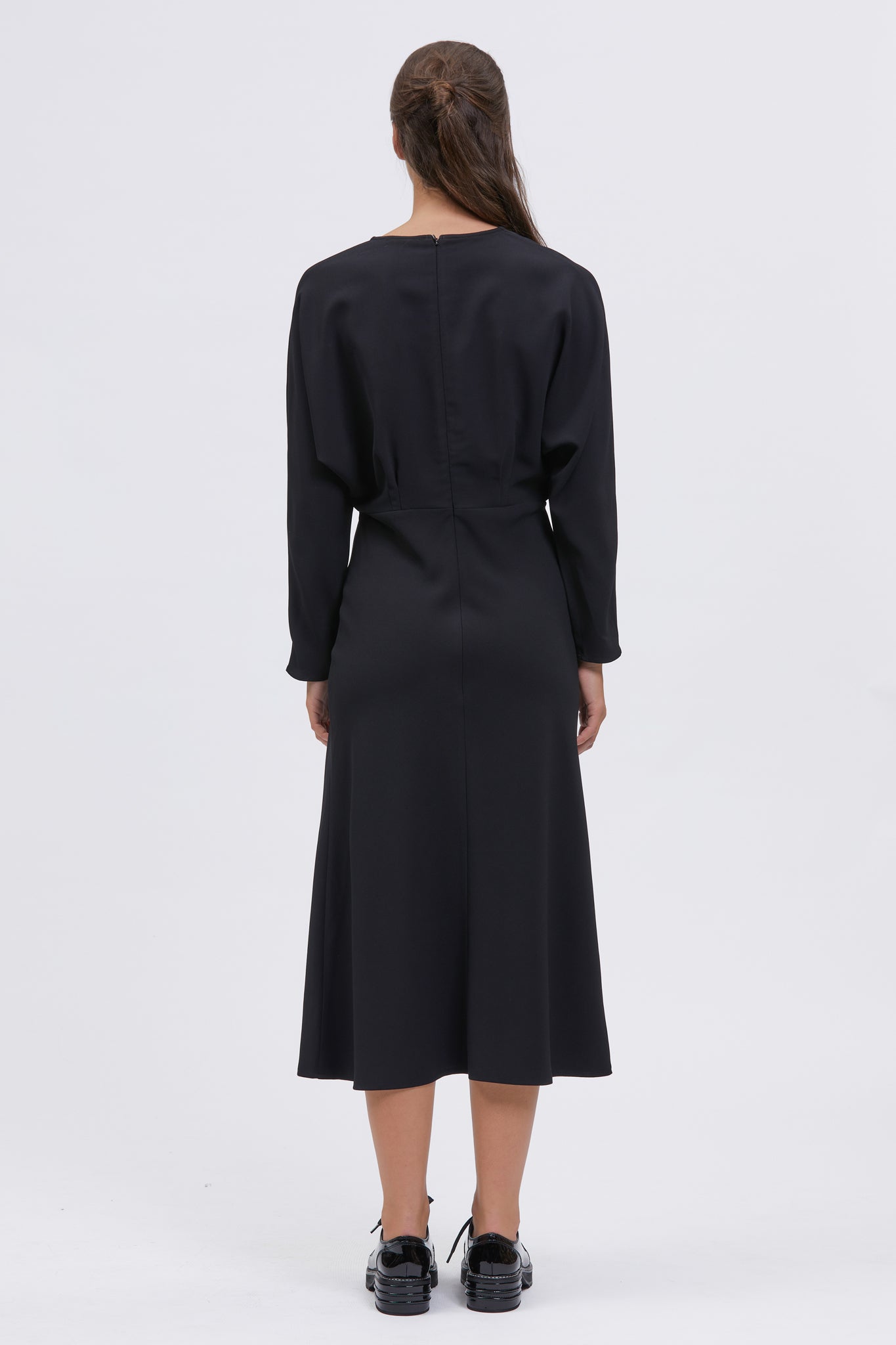 The Orlu Dress is a midi length style with a v-neckline and batwing full-length sleeves to the wrists. Features a fitted waist seam, triple front darts, double back darts and a centre back zip closure. The skirt is cut on a bias and flows down towards the hem. the fabrication is a smooth satin backed terelene.