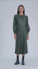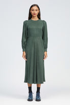 The Peregrine Dress is a mid-length style with a fitted upper body and waist that falls into a bias-cut flowy skirt. Features include balloon sleeves and organic-shaped gold button fastening on each cuff, a round neckline and a centre back slit which leads to a small gold button fastening at the back neck. Made in a soft, brushed Tencel twill weave fabrication.