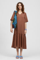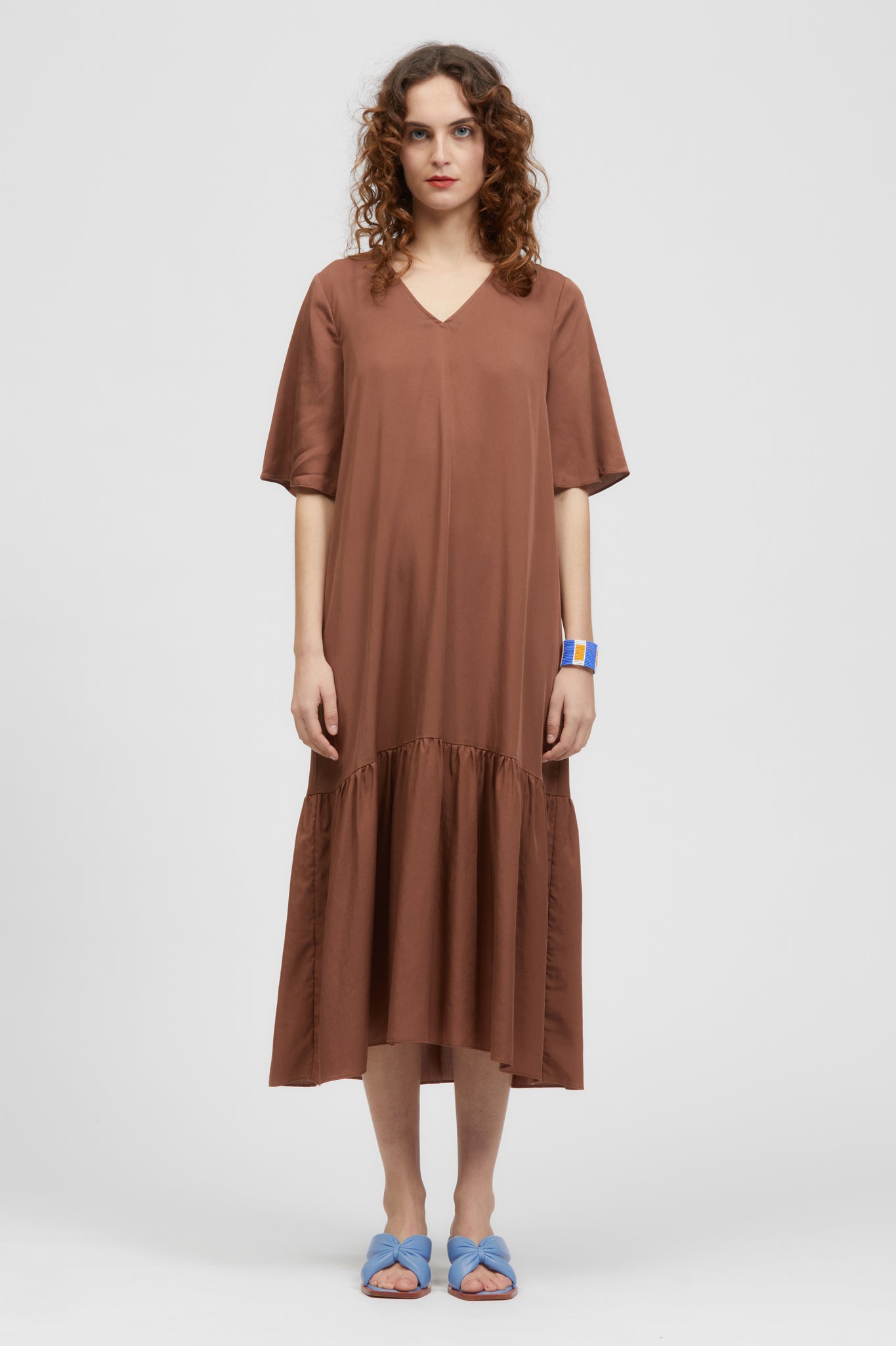 The Rafiki Maxi Dress is a v-neckline, relaxed fit maxi with a lower frill detailing on the skirt adding volume towards the hem. The style has a v-neckline front and lower v-neckline at the back with two long ties for fastening. This style is made with a soft Tencel blend.