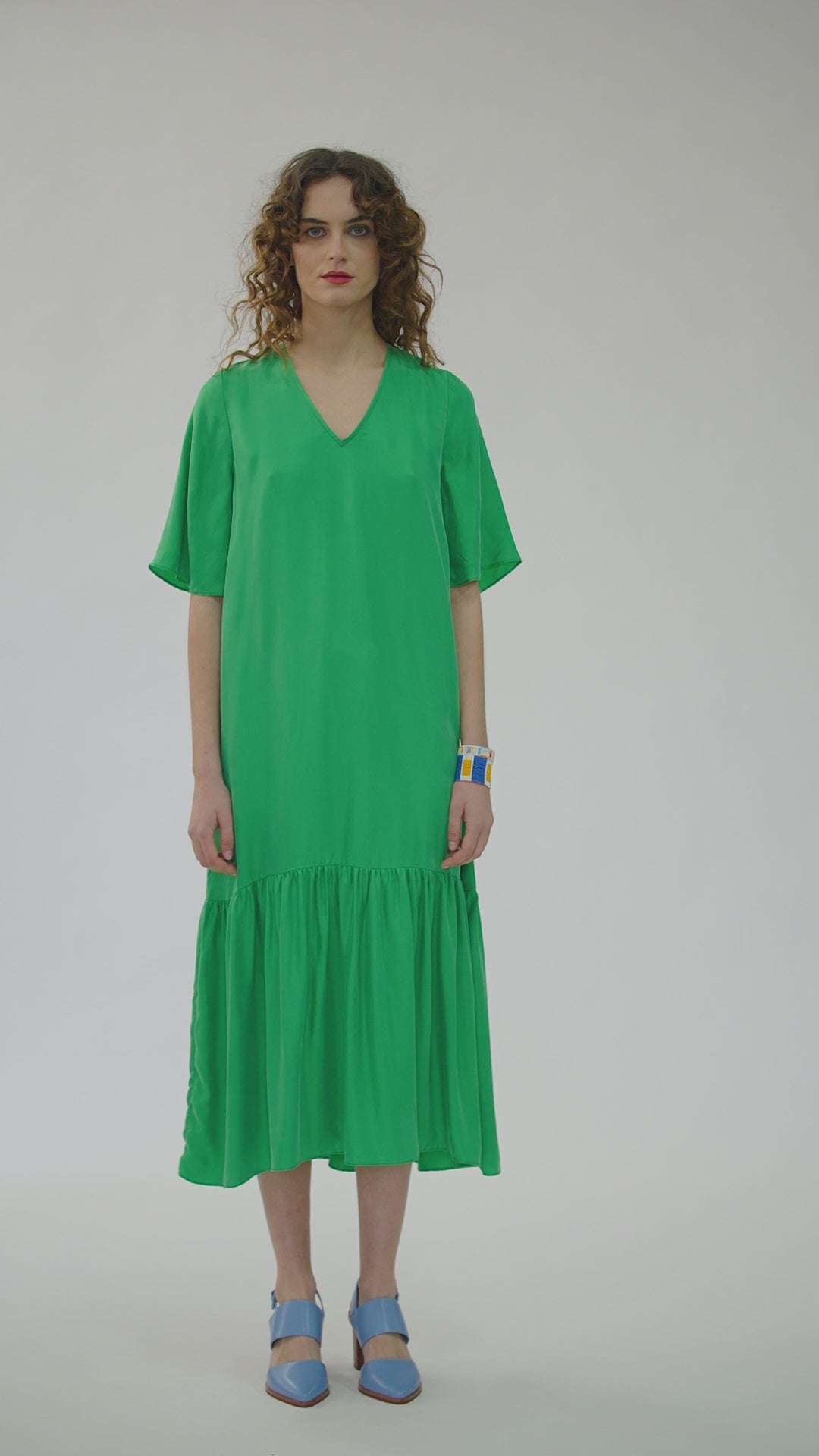 The Rafiki Maxi Dress is a v-neckline, relaxed fit maxi with a lower frill detailing on the skirt adding volume towards the hem. The style has a v-neckline front and lower v-neckline at the back with two long ties for fastening. This style is made with a soft Cupro/Viscose.