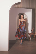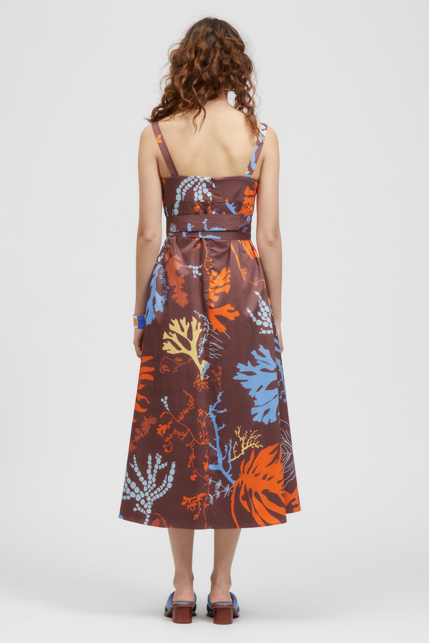 The Soko Maxi Dress is a sleeveless, v-neckline, maxi length a-line style. The front pleats create a fitted upper that flares out towards the hem. This style includes a detachable belt that can be tied at the waist in various ways. There is a centre-back zip fastening and elasticated internal support around the bust. This style offers inseam pockets and is made in a structured Cotton/Tencel blend featuring búl’s house-designed Brown Seaweed Print.