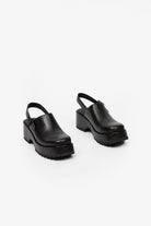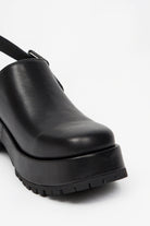 The Gada Clog is a rounded square toe style with an ankle strap and open back. This style offers a self-covered platform heel and lug sole. Made in smooth leather.