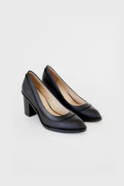 The Tippen Heel is a sophisticated leather pump with a pointed toe, contrast textured panel and a chunky heel.