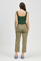 The Pillar Singlet is a sleeveless cropped rib knit style with a square neckline. Made in a soft Rayon/Nylon blend.