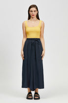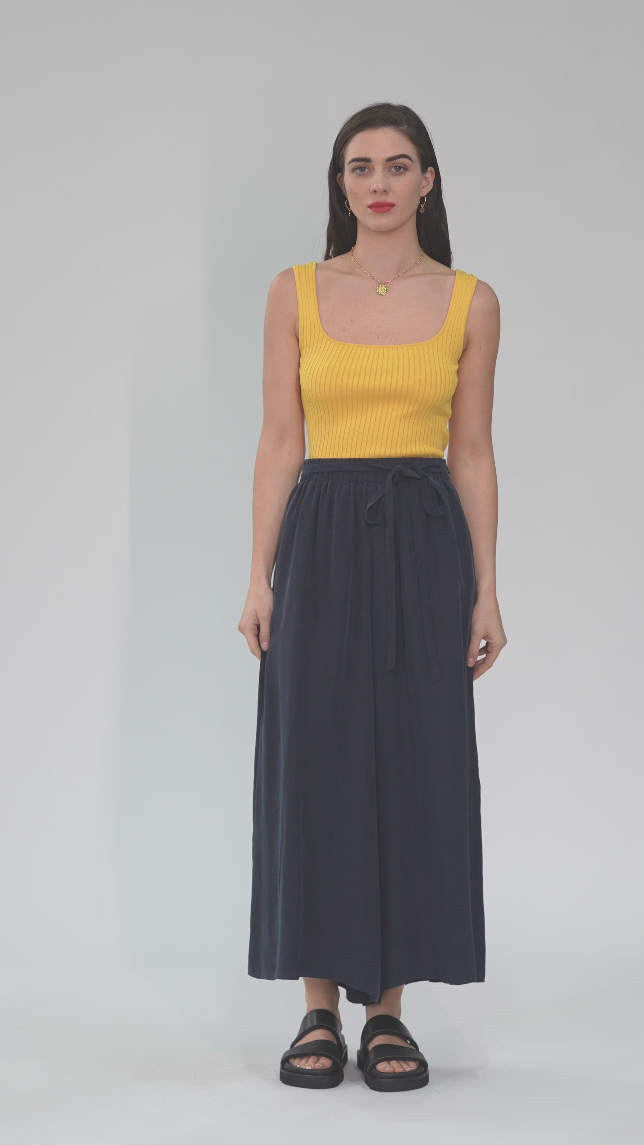 The Pillar Singlet is a sleeveless cropped rib knit style with a square neckline. Made in a soft Rayon/Nylon blend.