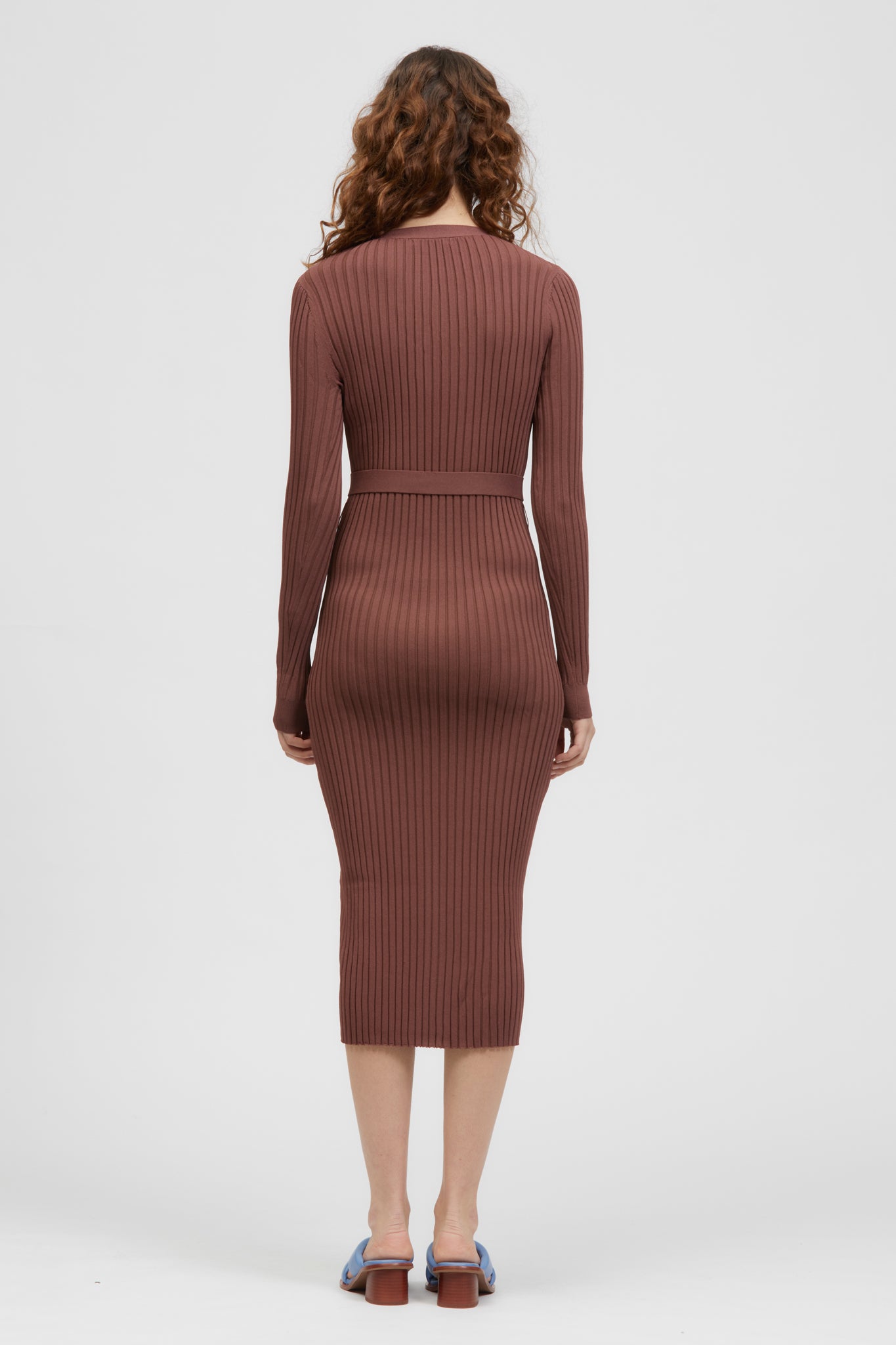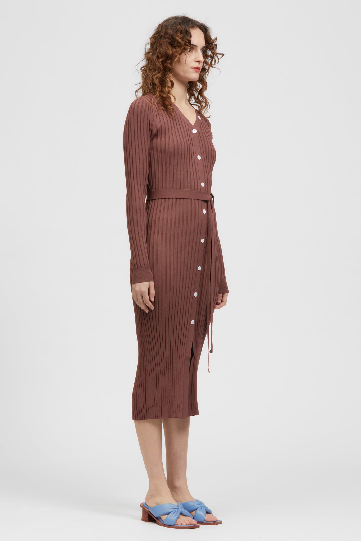 The Söndag Dress is a ribbed knit mid-length style with shell button detailing. This style offers a v-neckline, front split, full-length sleeves, and a detachable waist tie all made in a soft Rayon/Nylon blend.