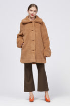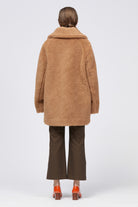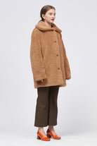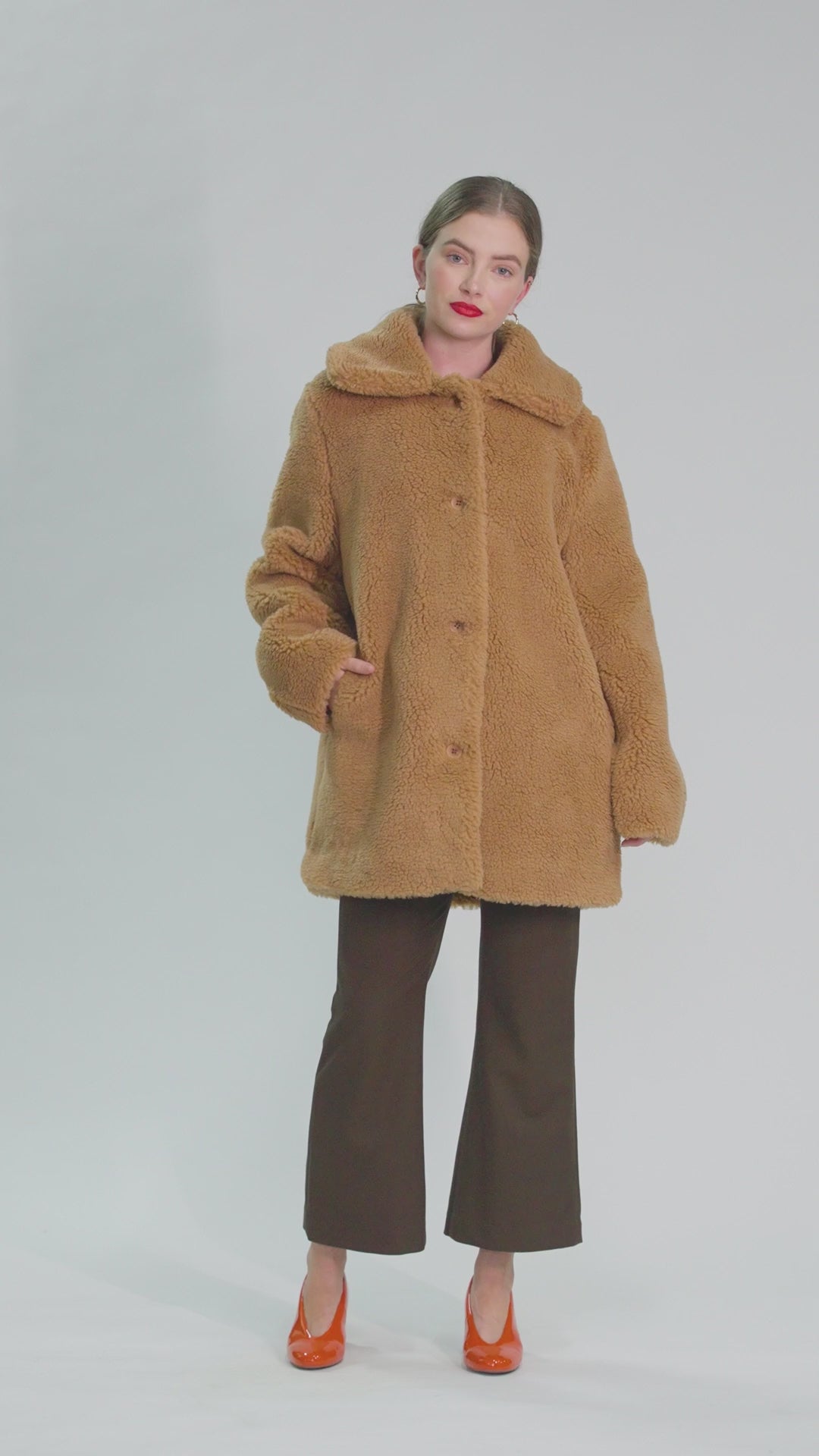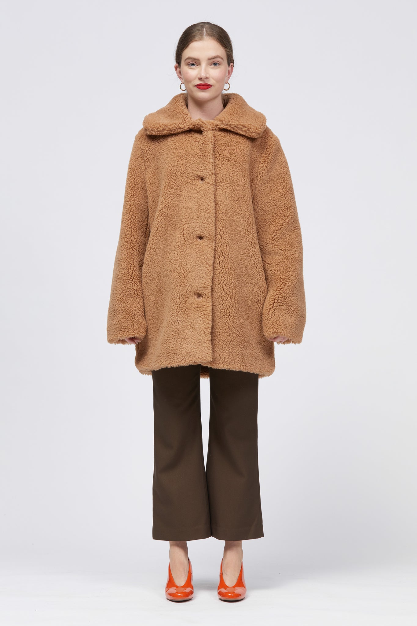 The Molo Coat is a boxy, single-breasted style. This style features slant pockets at the front and an interior breast pocket. Made with an ultra-cosy wool blend pile outer and fully lined with brown satin.