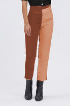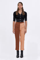 The Brigue Pant is a cigarette style that has a cropped length, high-waist, front pleats and a side zip closure. Features contrast coloured panelling and a split at the hem edge.