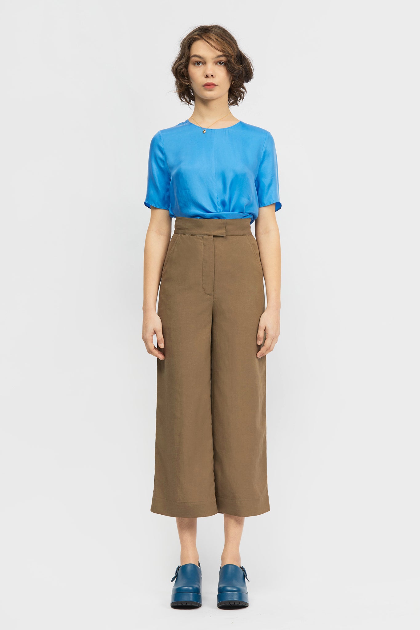 The Brisa Pant is a wide leg, high-waisted style with a cropped length. This style includes slanted front pockets and a back pocket with flap. Made in a soft tencel/ linen blend. This style can be paired back with your existing wardrobe favourites or with the Minhwa Blazer in matching fabric as a set.