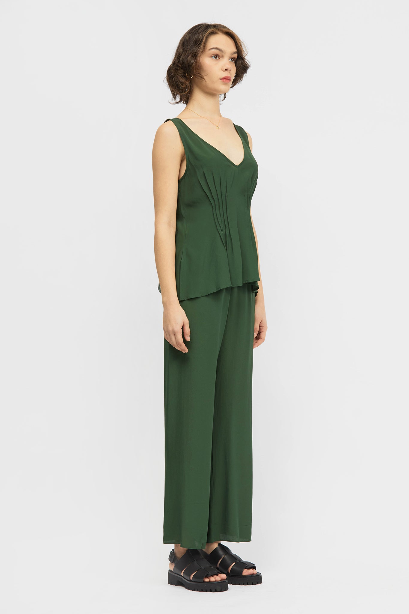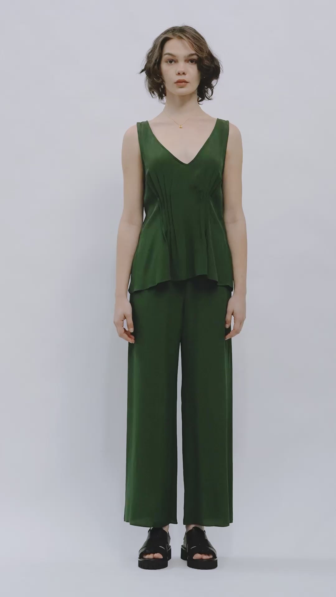 The Soju Top is a sleeveless, regular fit style. Features include a deep V-neckline and pleat detailing at the front and back. Made from a soft and flowy acetate blend. This style can be paired back with your existing wardrobe favourites or with the Gamsa Robe and Pado Pant in matching fabric as a set.