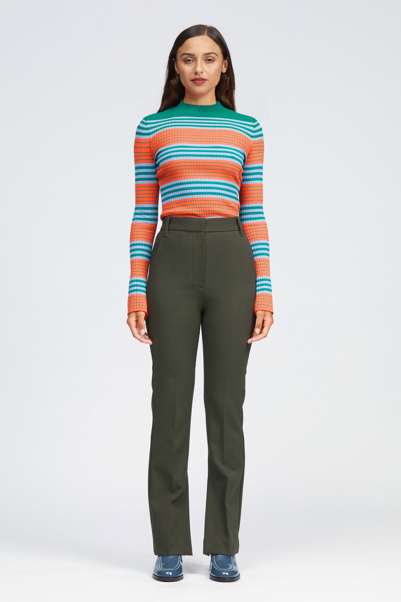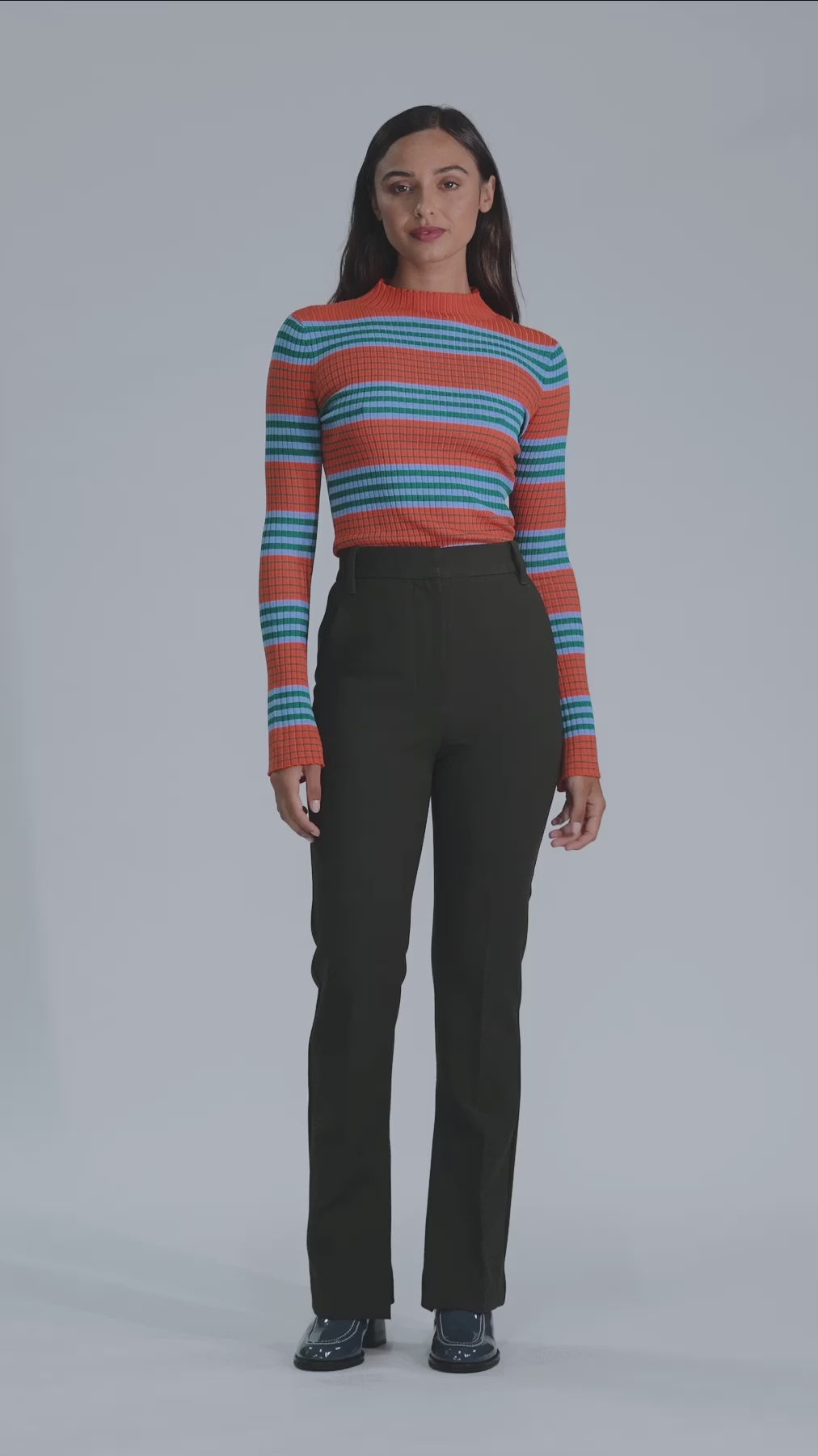 The Wiwat Trouser is a high-waisted, full-length, straight-leg style with a pressed line detail along the centre front and back legs. This style features inner leg vents, two slant pockets at the front, and two welt pockets at the back body. The front opening fly includes an interior zip, and fly extension which conceals the hook and eye tabs and an interior button. This style includes belt loops around the waistband and back darts for flattering shaping. Made with a Polyester/Viscose blend fabrication with slight stretch.