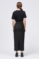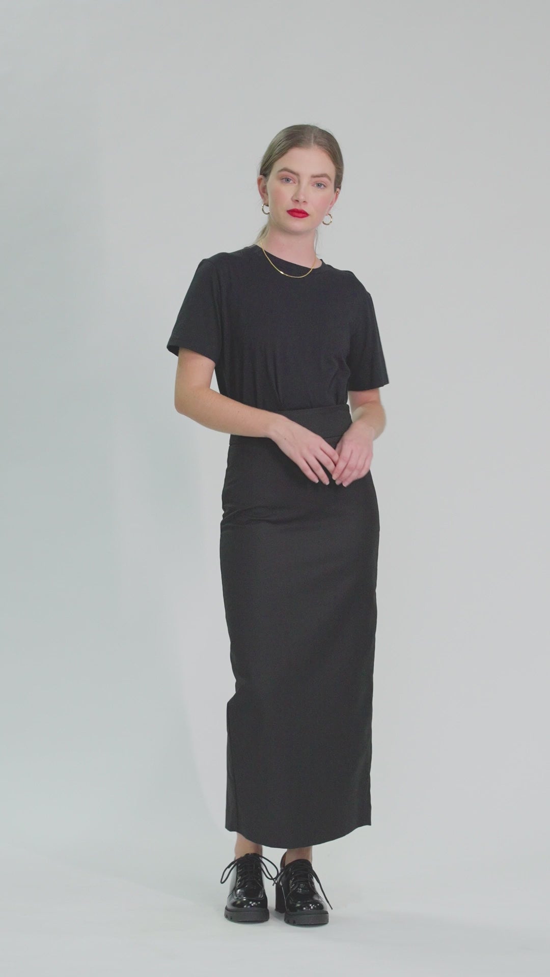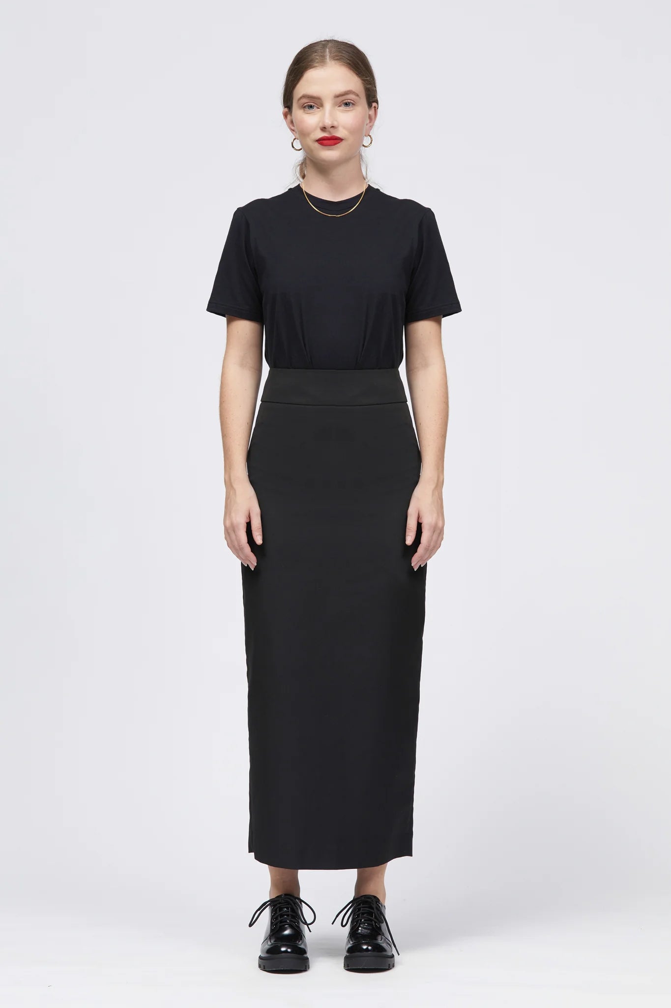 The Jutro Skirt is a high-waisted, maxi-length pencil skirt with a fitted cut. This style includes a back slit for ease of movement. Made with a soft Tencel blend.