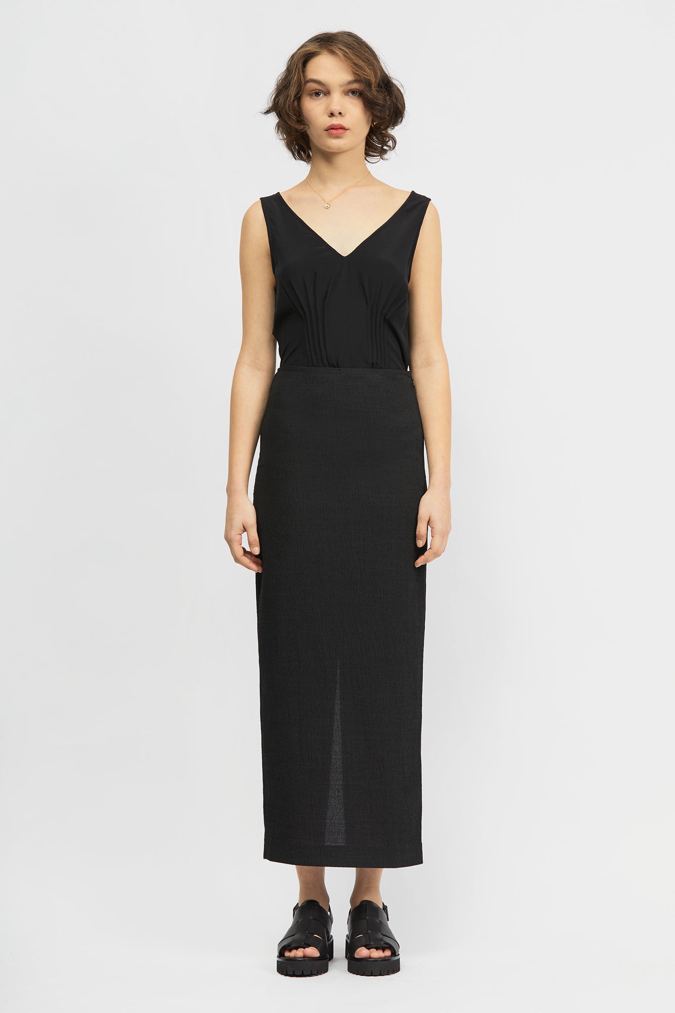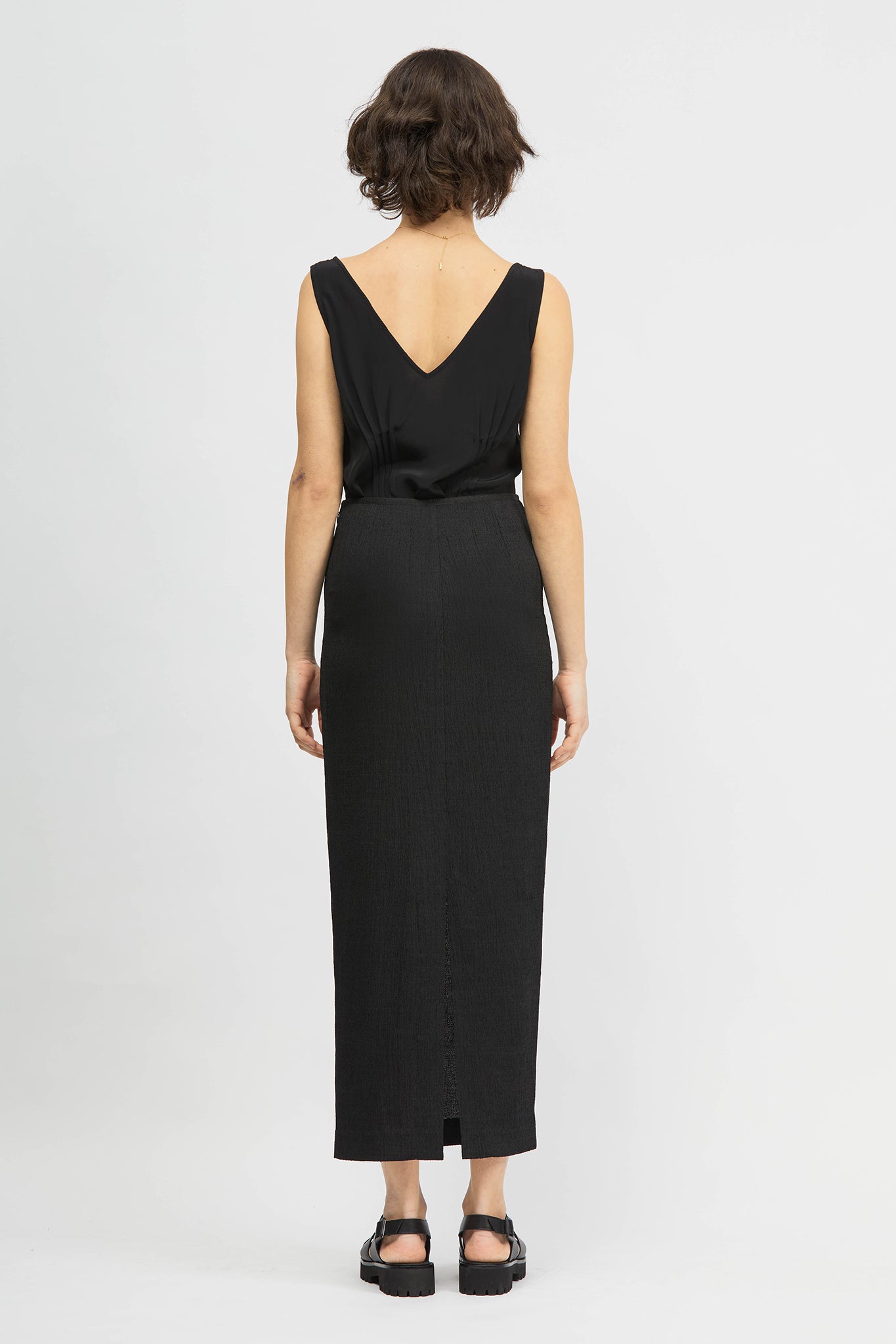 The Obrigado Skirt is a high-waisted, maxi-length, pencil skirt in a fitted style. This style offers a back slit for ease of movement and side seam invisible zip closure. Made in a stretch seersucker fabrication.