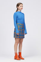 The Uroda Skirt is a high-waisted mini-length style with a soft a-line silhouette. This style includes front and back seam detailing. Made in a Viscose/Cotton blend fabrication with búl’s house-designed Blue Warped Check Print. Fully lined with vibrant orange satin. This style can be paired back with your existing wardrobe favourites or with the Miasto Shirt in matching fabric as a set.
