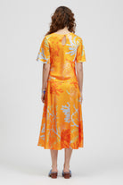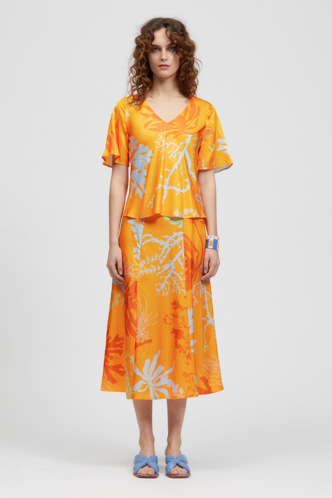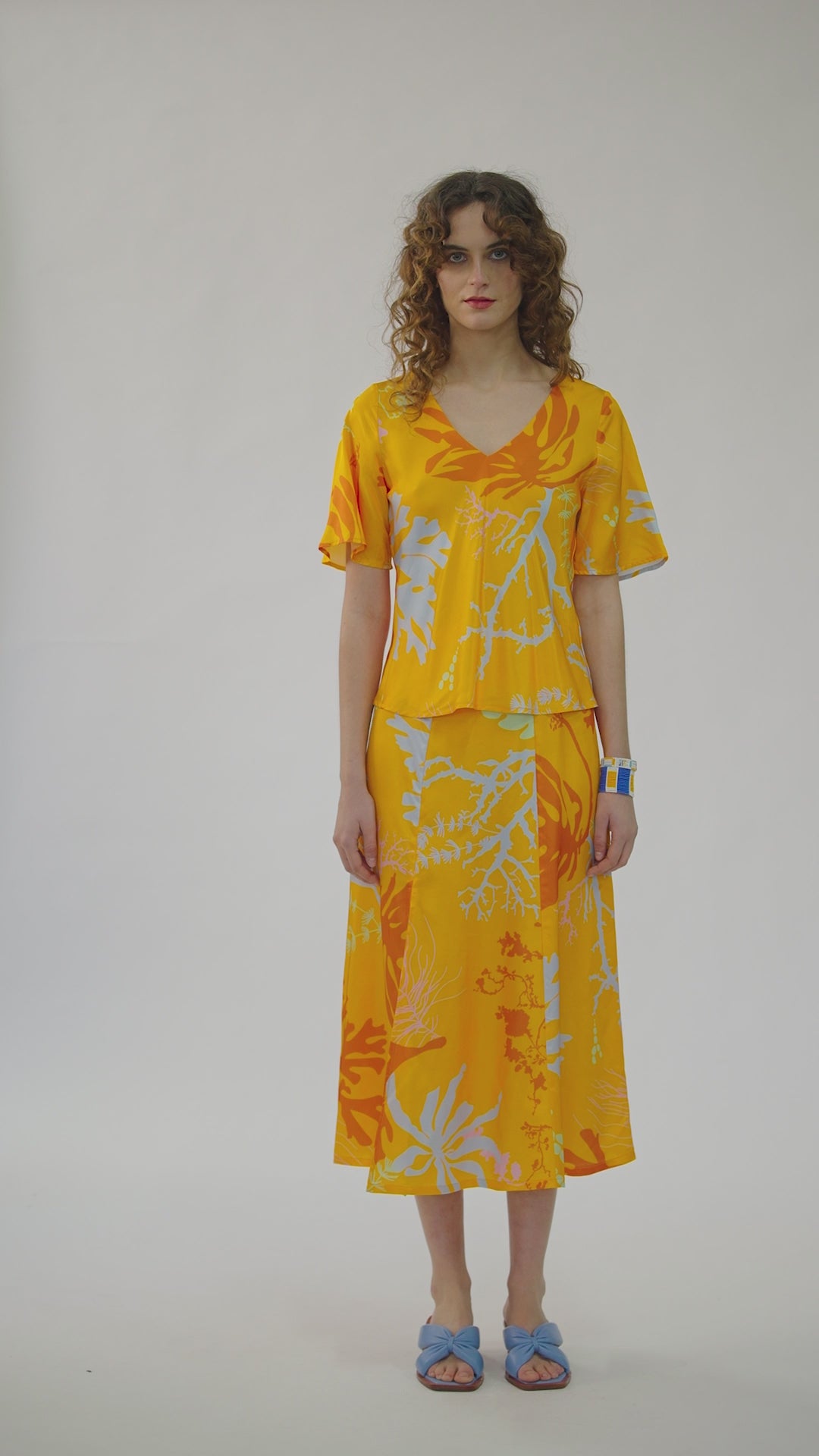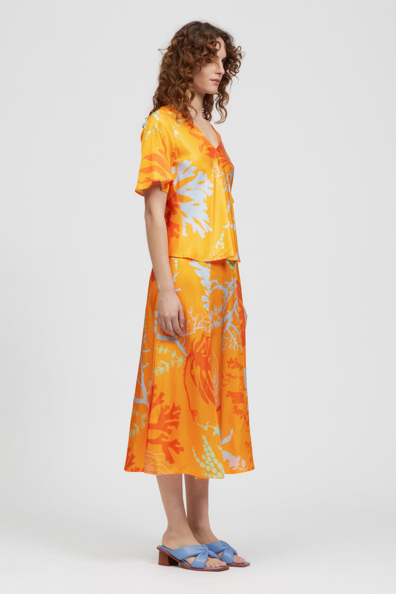 The Asante Top is a bias cut, v-neck style featuring an asymmetrical back keyhole detailing with a self-covered button fastening at the back neck. This style finishes at the hip and offers short-length relaxed sleeves. Made in a smooth Viscose fabrication with búl’s house-designed Orange Seaweed Print. This style can be paired back with your existing wardrobe favourites or with the Moyo Midi Skirt in matching fabric as a set.