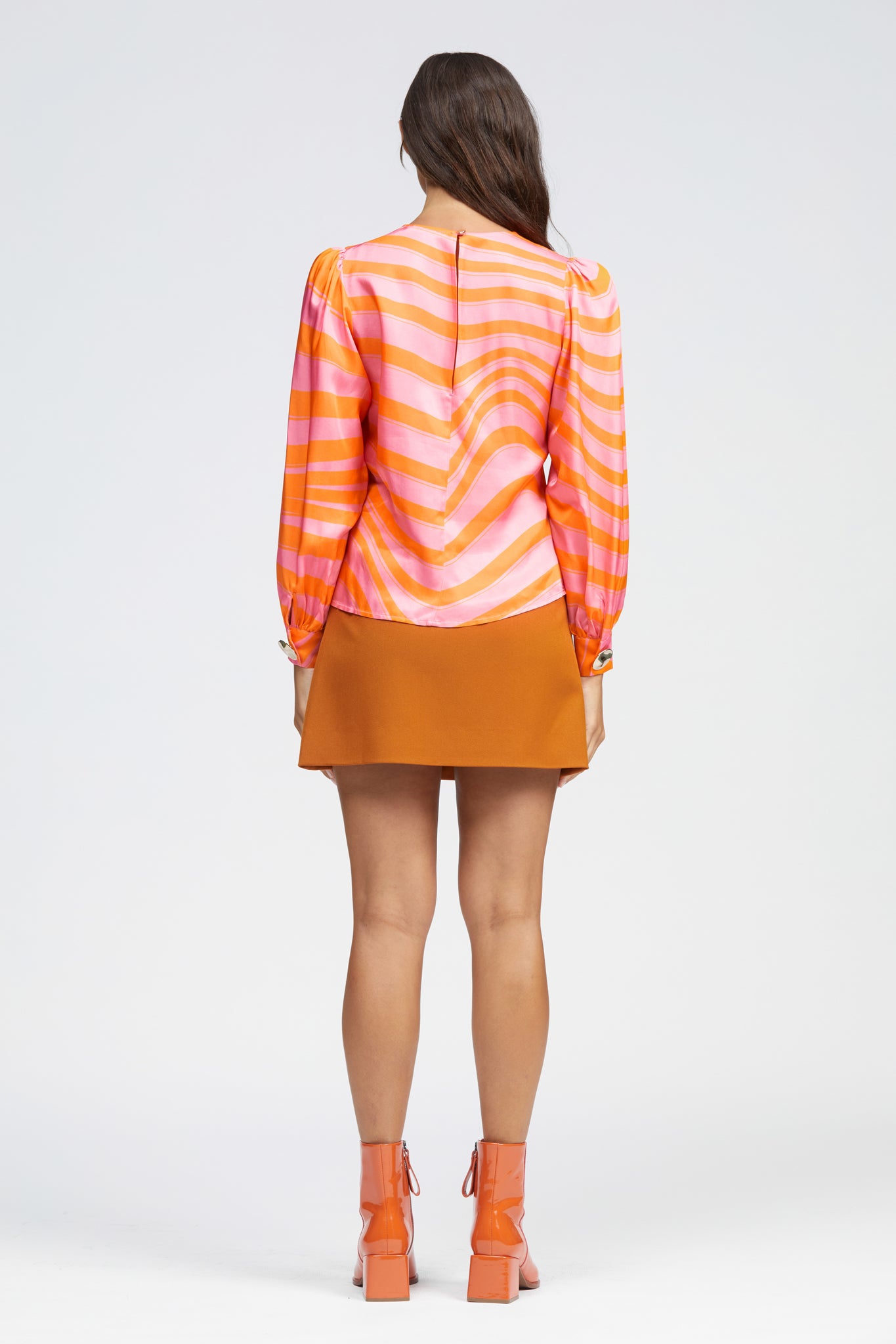 The Belmont Top is designed as a relaxed fit through the body with balloon style sleeves. Details include an organic-shaped gold button fastening on each cuff and centre back slit which leads to a small gold button closure at the top. Made in a smooth Viscose with búl’s house-designed Squiggle Print. This style can be paired back with your existing wardrobe favourites or with the Hilden Skirt in the same print as a matching set.