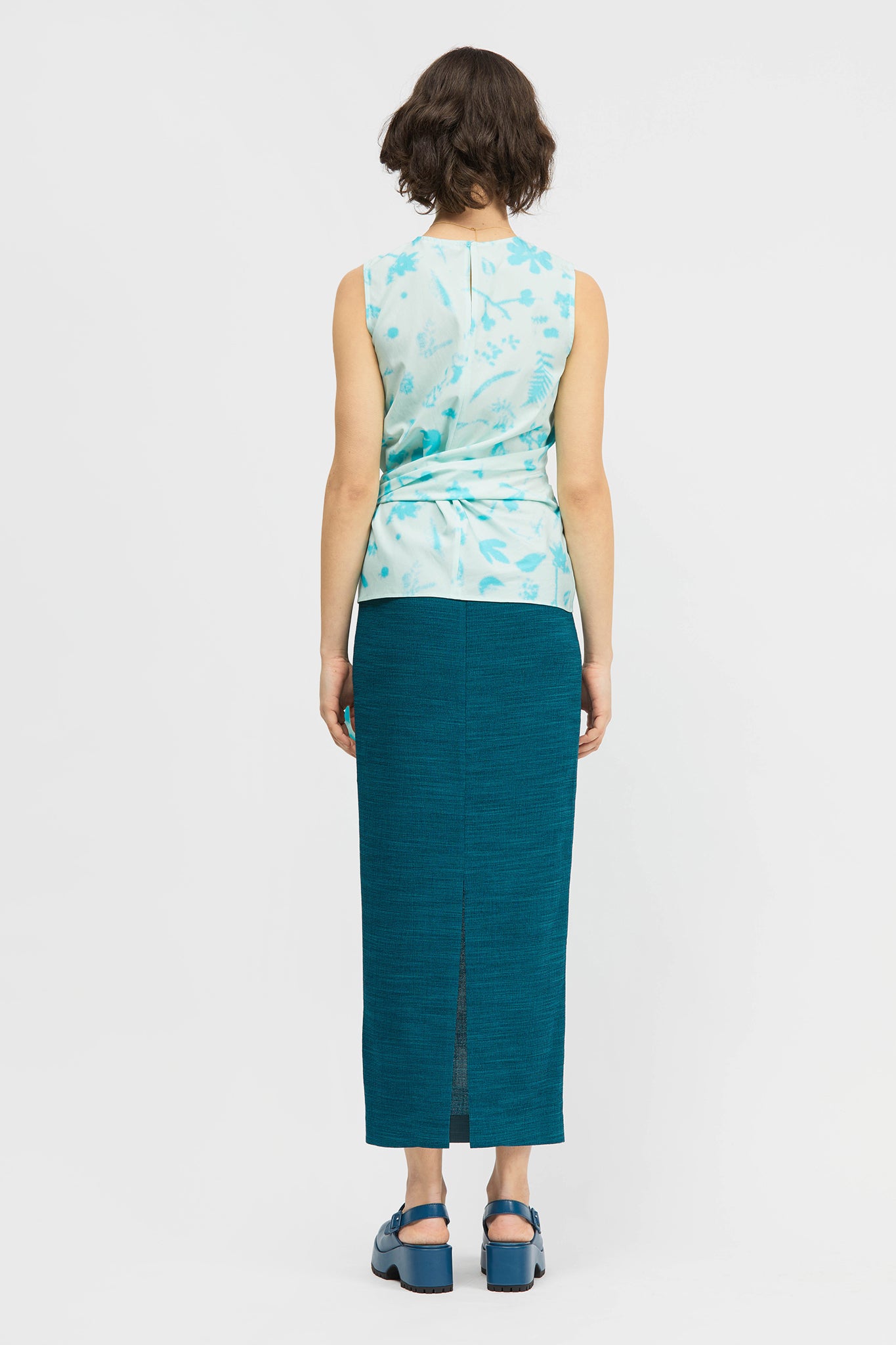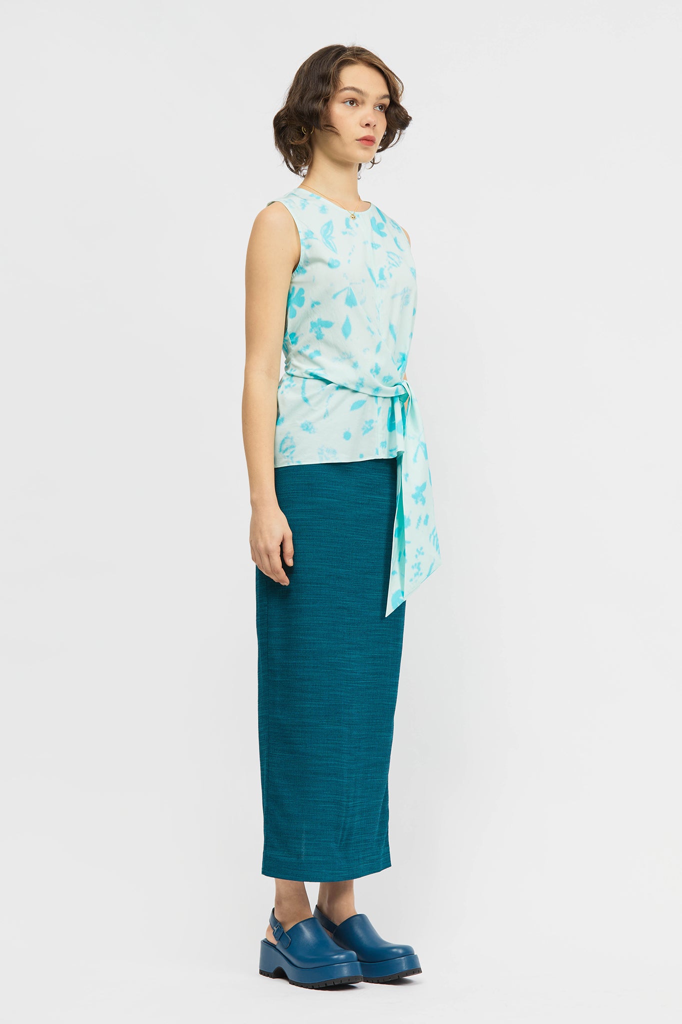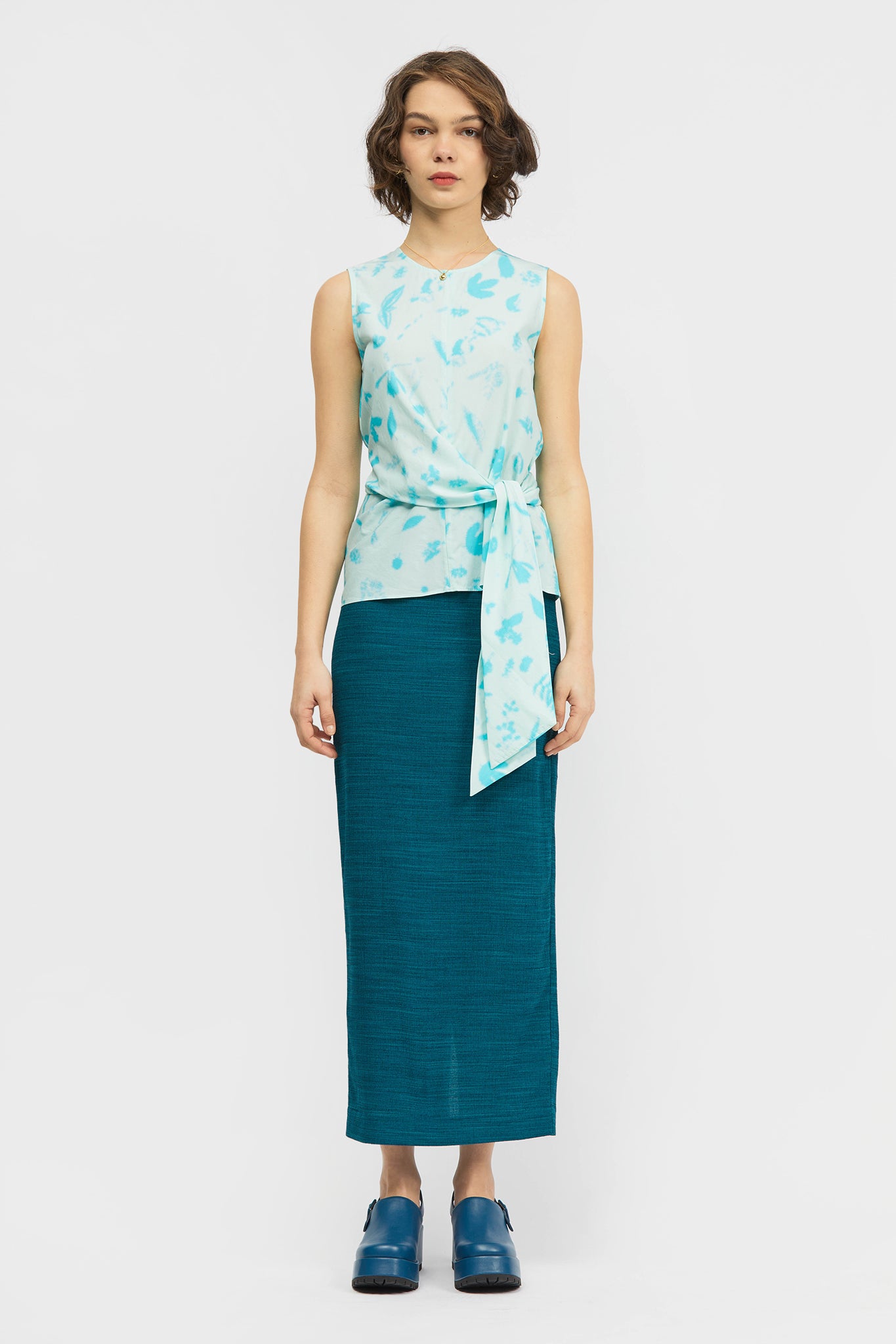 The Goyo Top is a sleeveless, regular fit style. Features include a rounded neckline and tie detail that ties at side waist. Made in a soft viscose/ cotton blend in búl’s in-house designed Namu Print.