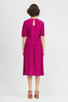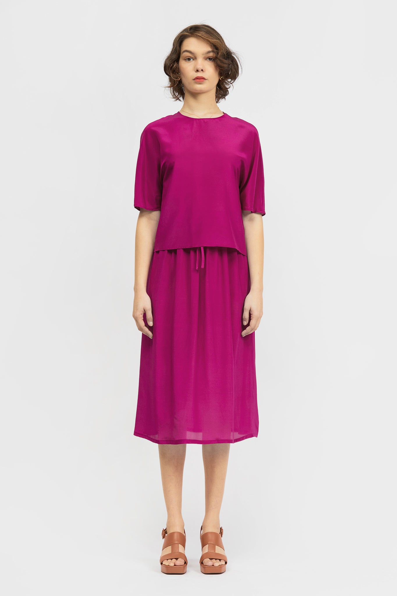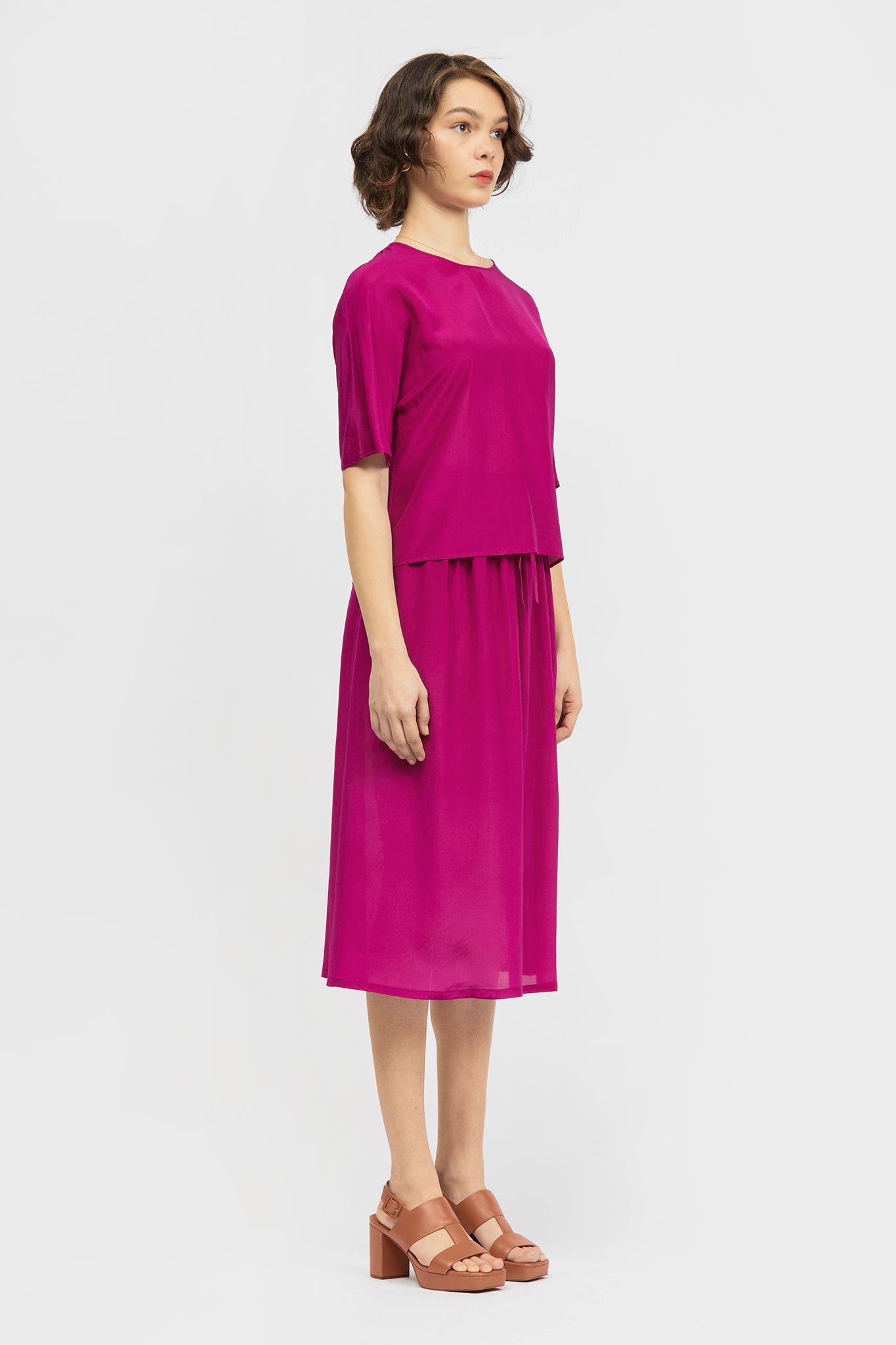 The Joa Top is a short sleeve, relaxed fit style. Features include a round neckline, back neck keyhole and button detail and batwing style sleeves. Made in a smooth crepe de chine silk. This style can be paired back with your existing wardrobe favourites or with the Bingsu Skirt in matching fabric as a set.