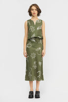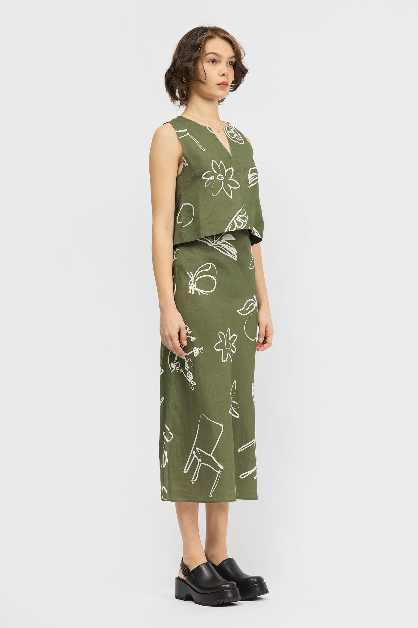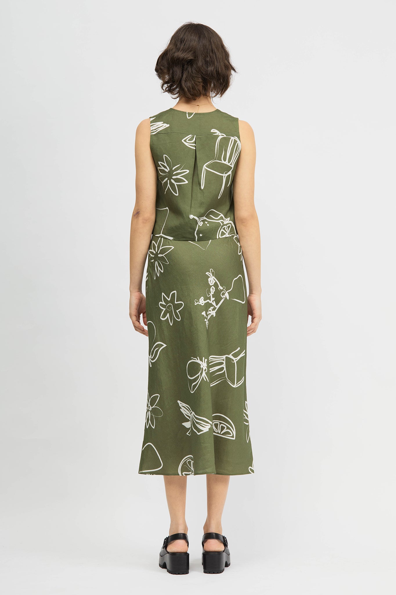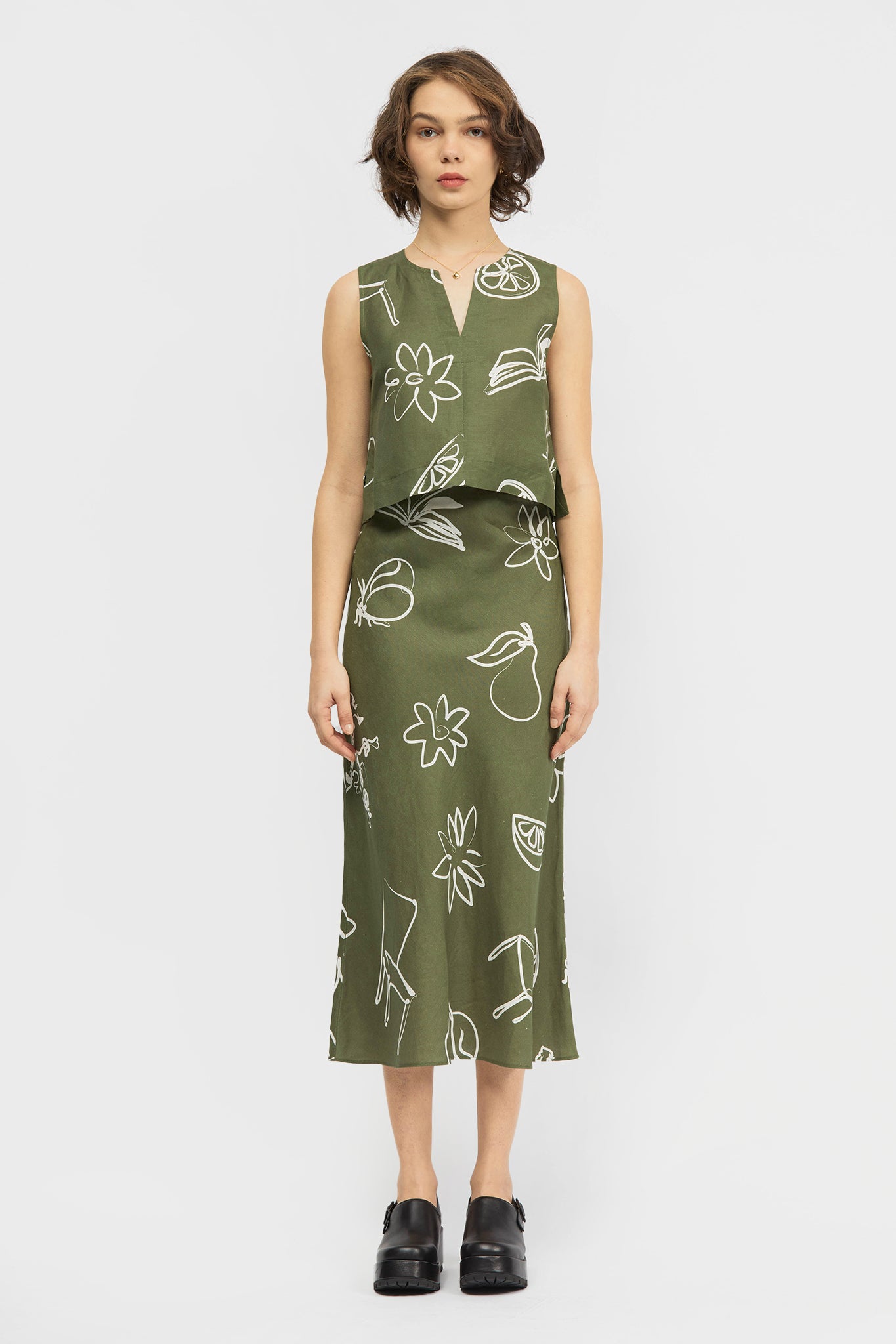 The Onggi Top is a sleeveless style in a cropped length and A-line silhouette. Details include side splits and an open V-neckline. Made from a soft linen/ viscose blend in búl’s in-house designed Bom Print. This style can be paired back with your existing wardrobe favourites or with the Sorrir Skirt in matching fabric as a set.