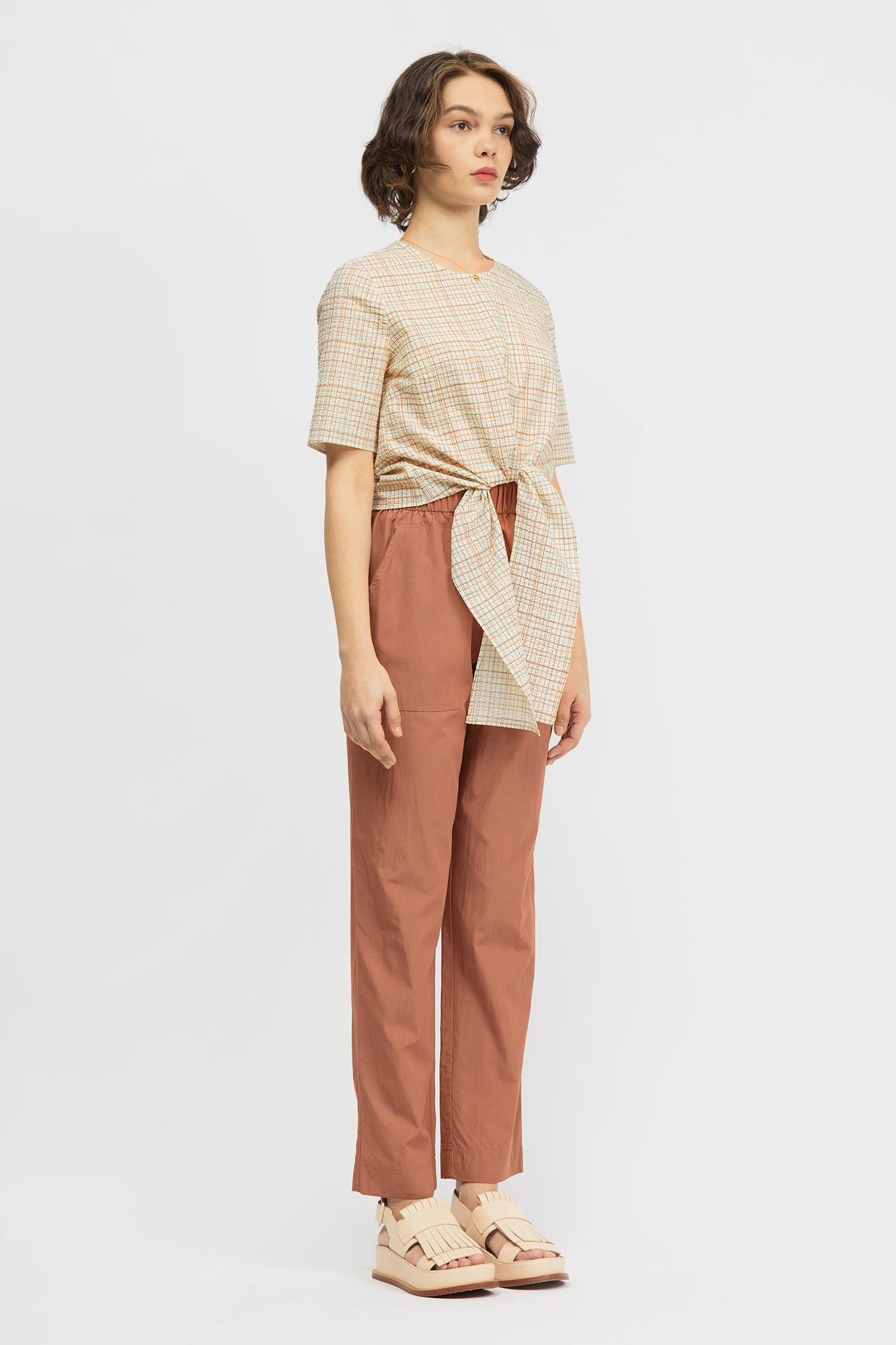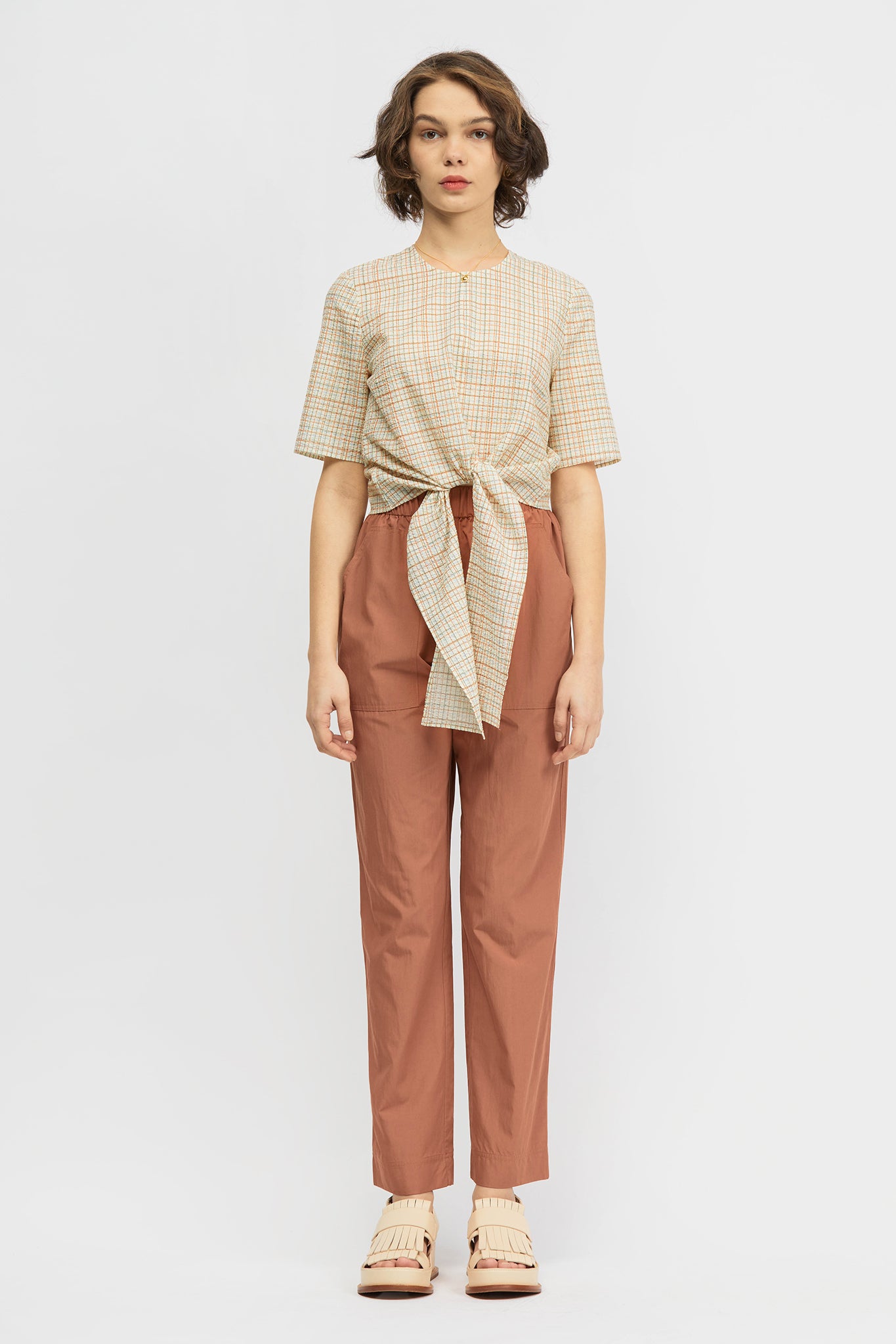 The Ver Top is a short-sleeve, regular fit style. This style offers front ties which can be wrapped around the body, fastened at the front, left hanging or tucked in. Made with a cotton seersucker fabrication.