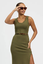 The Concha Singlet is a crop singlet style featuring a scalloped design detail along the neckline and armhole. Made in a Viscose/Nylon stretch blend. This style can be paired with your existing wardrobe favourites or with the Concha Skirt in matching fabric as a set.