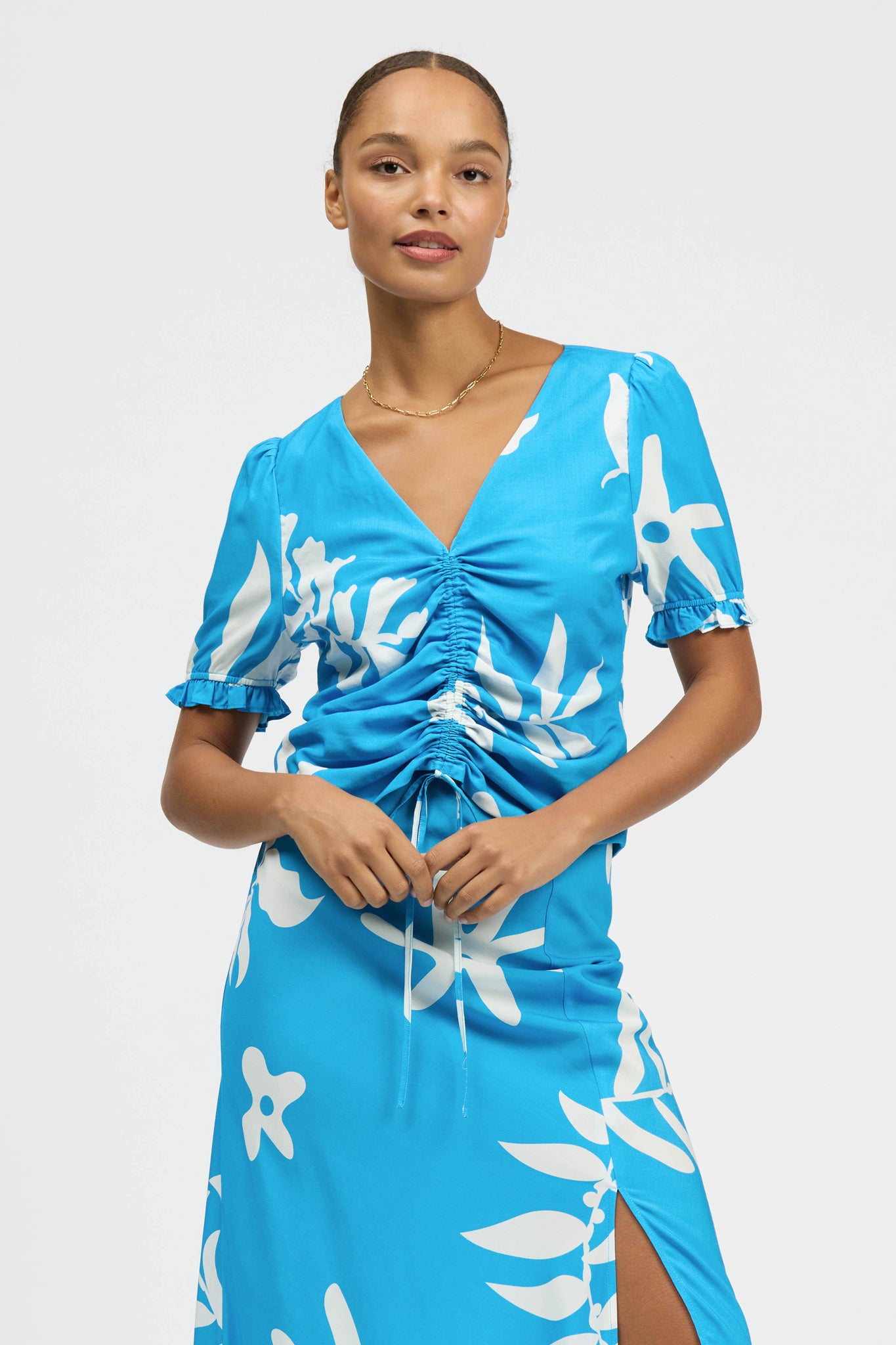 The Reuna Top features a drawstring tie front design with frilled sleeve openings, made in a soft Rayon and Lyocell blend. This style can be paired with your existing wardrobe favourites or with the Samara Skirt in matching fabric as a set.