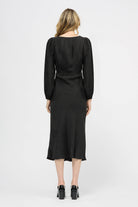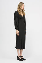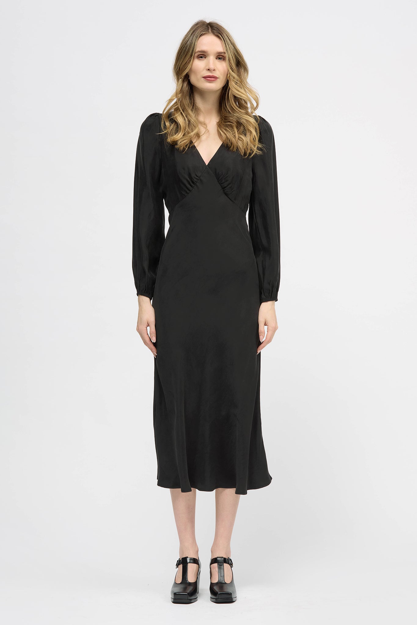 The Bungaree Dress is a fitted style in mid-length. This style features a low neckline with gather detailing along the bust seams, balloon shaped sleeves with an elasticated cuff and a bias-cut, flowy skirt. Made in a soft cupro/ viscose blend.