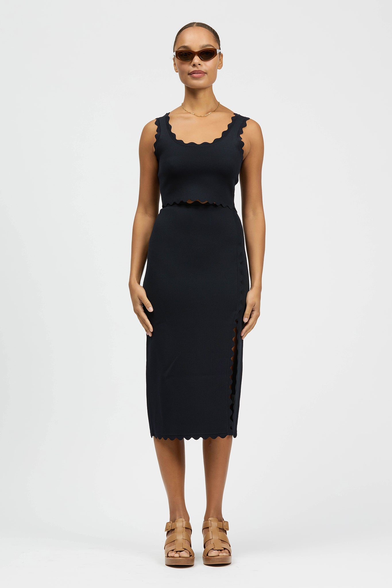 The Concha Skirt is a midi-length style featuring a scalloped design detail along the hemline and split. Made in a Viscose/Nylon stretch blend. Pair with the Concha Top in matching fabric as a set.