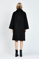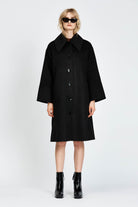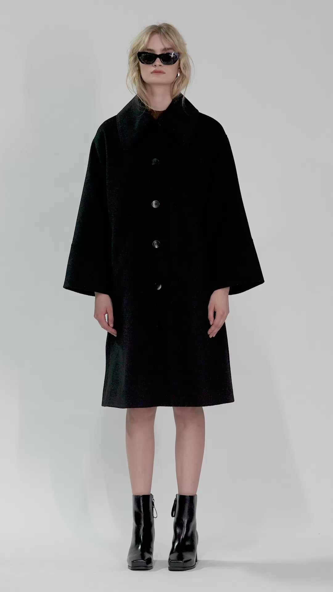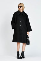 The Varjo Coat is a mid-length silhouette with a button-up front, made from wool blend and fully lined with soft satin. Styled with the Lumo Boot.