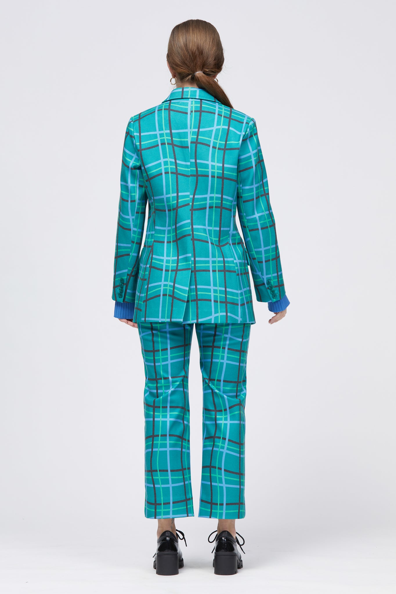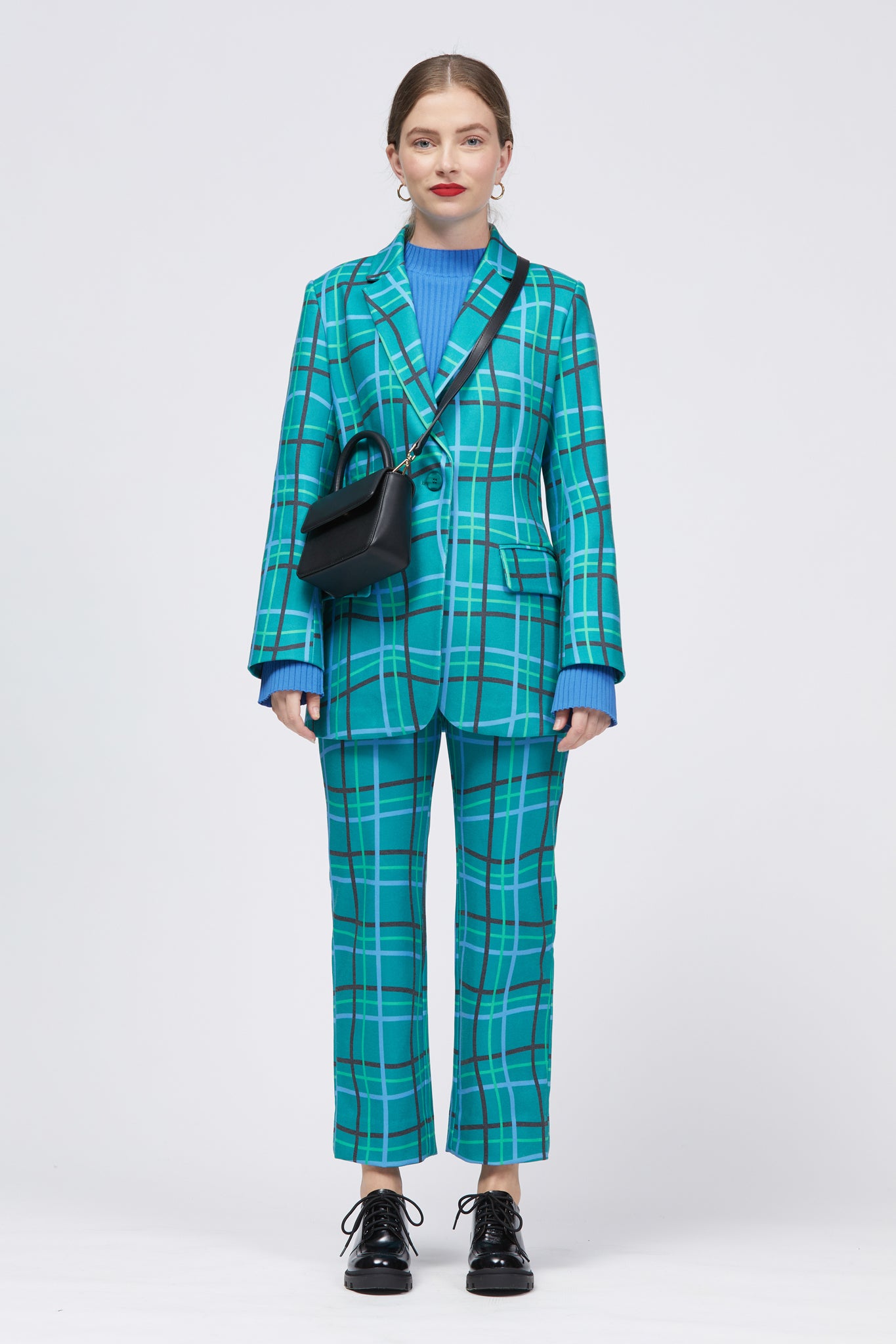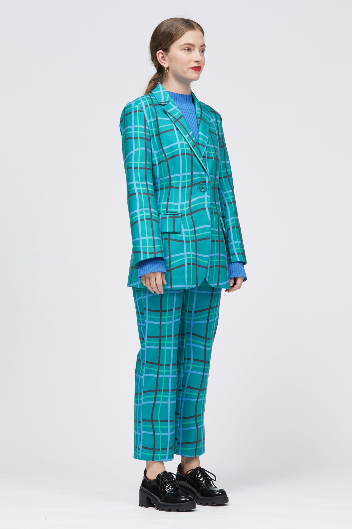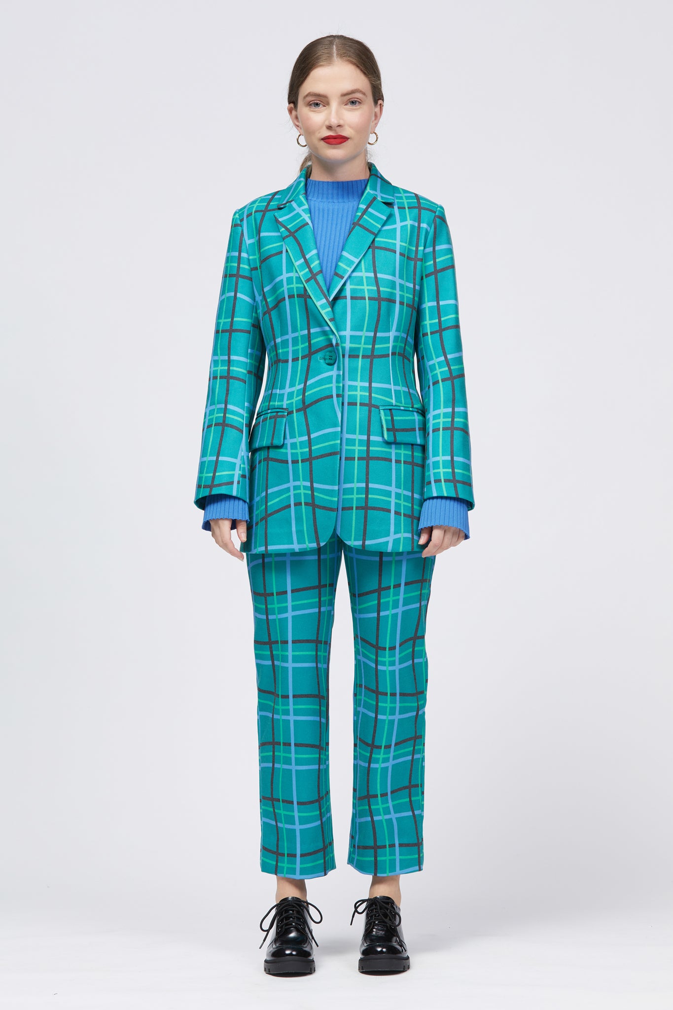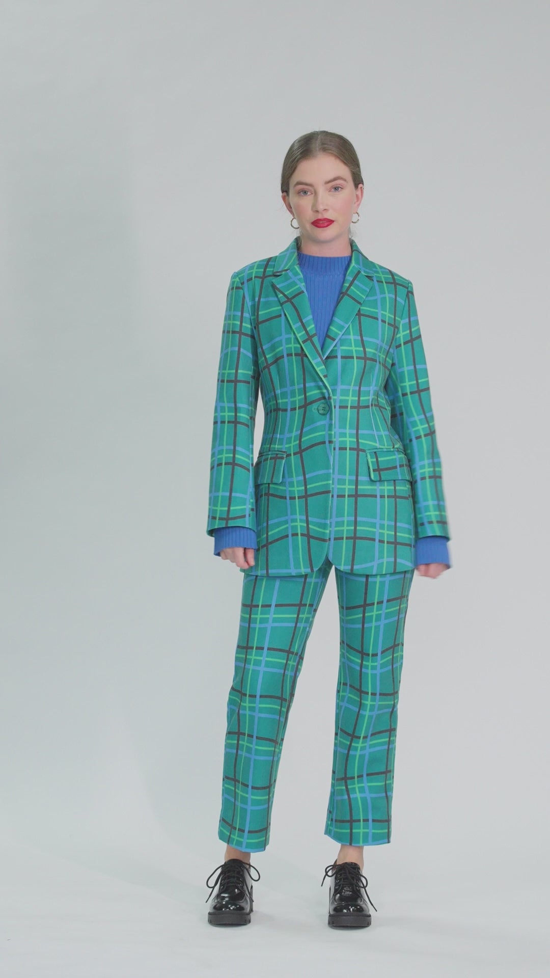 The Las Blazer is a single-breasted, long-line blazer with a regular fit. This style offers front pockets, an internal breast pocket and a classic collar. Made with a soft, stretchy Tencel blend fabrication with búl’s house-designed Green/Blue Warped Check Print, and fully lined with blue satin. This style can be paired back with your existing wardrobe favourites or with the Kolor Dress or Liseburg Pant in matching fabric as a set.