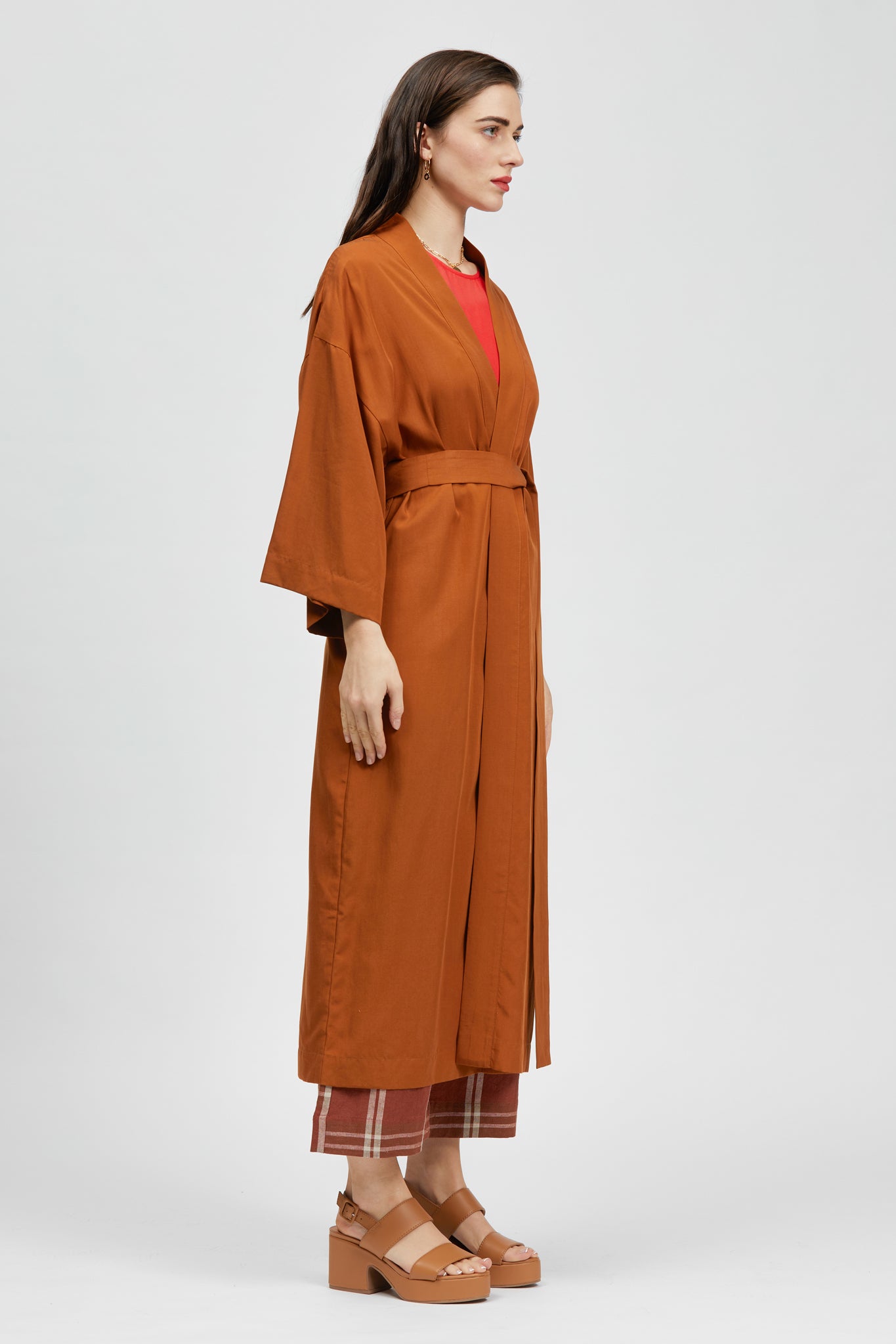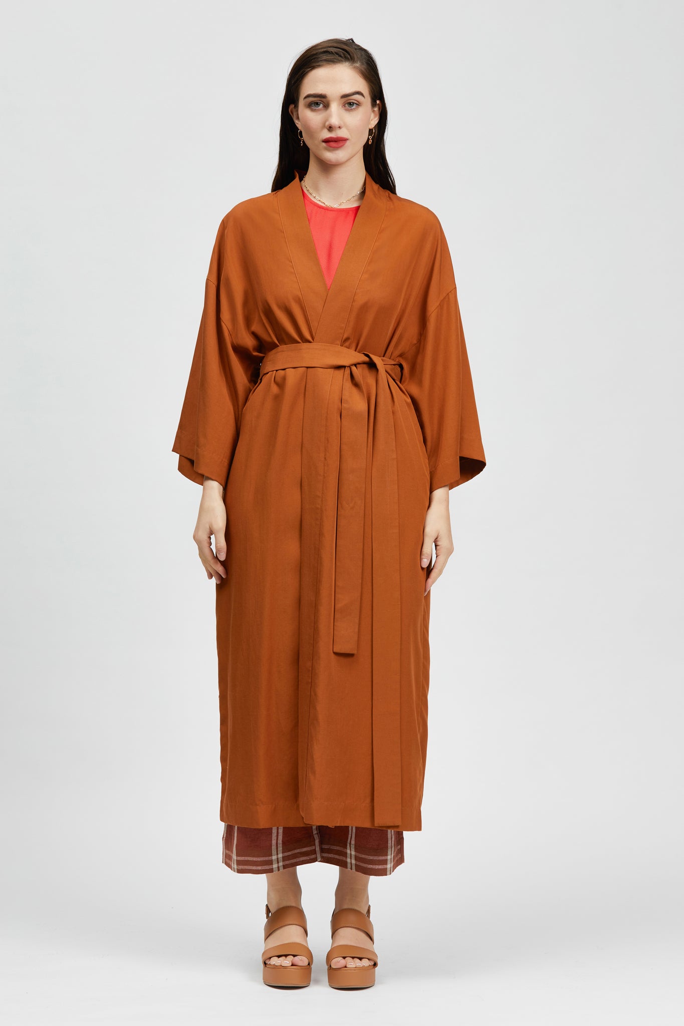 The Sol Robe is a mid-length, wrap style with a relaxed fit and wide sleeves. This style offers a detachable tie-up belt and inseam pockets. Made in a soft tencel blend.