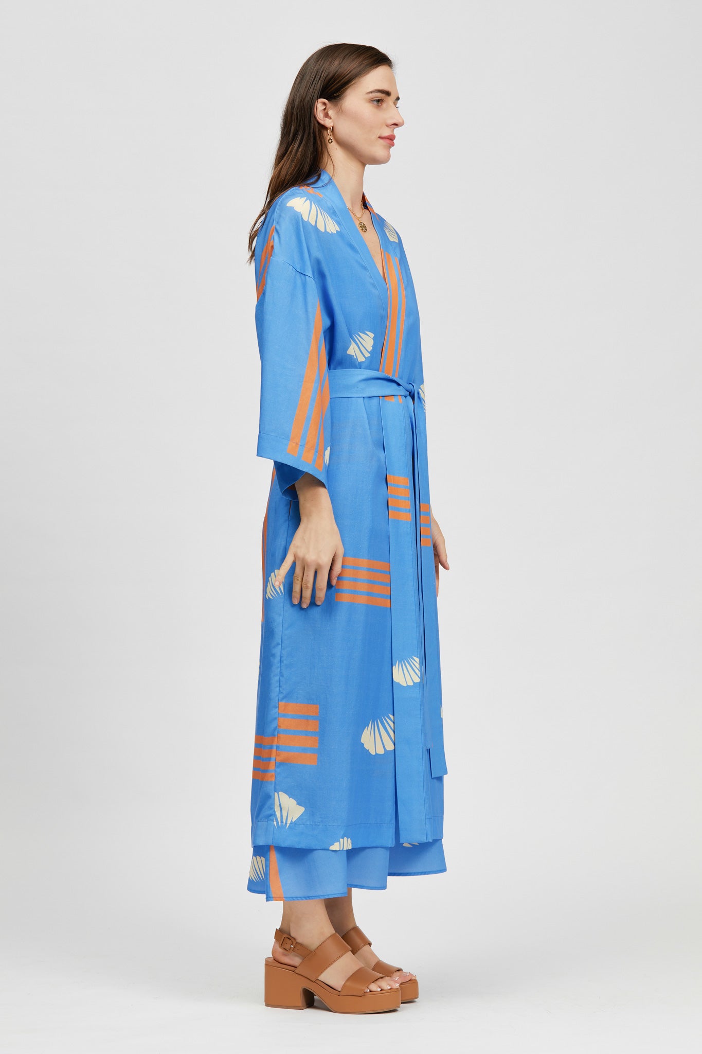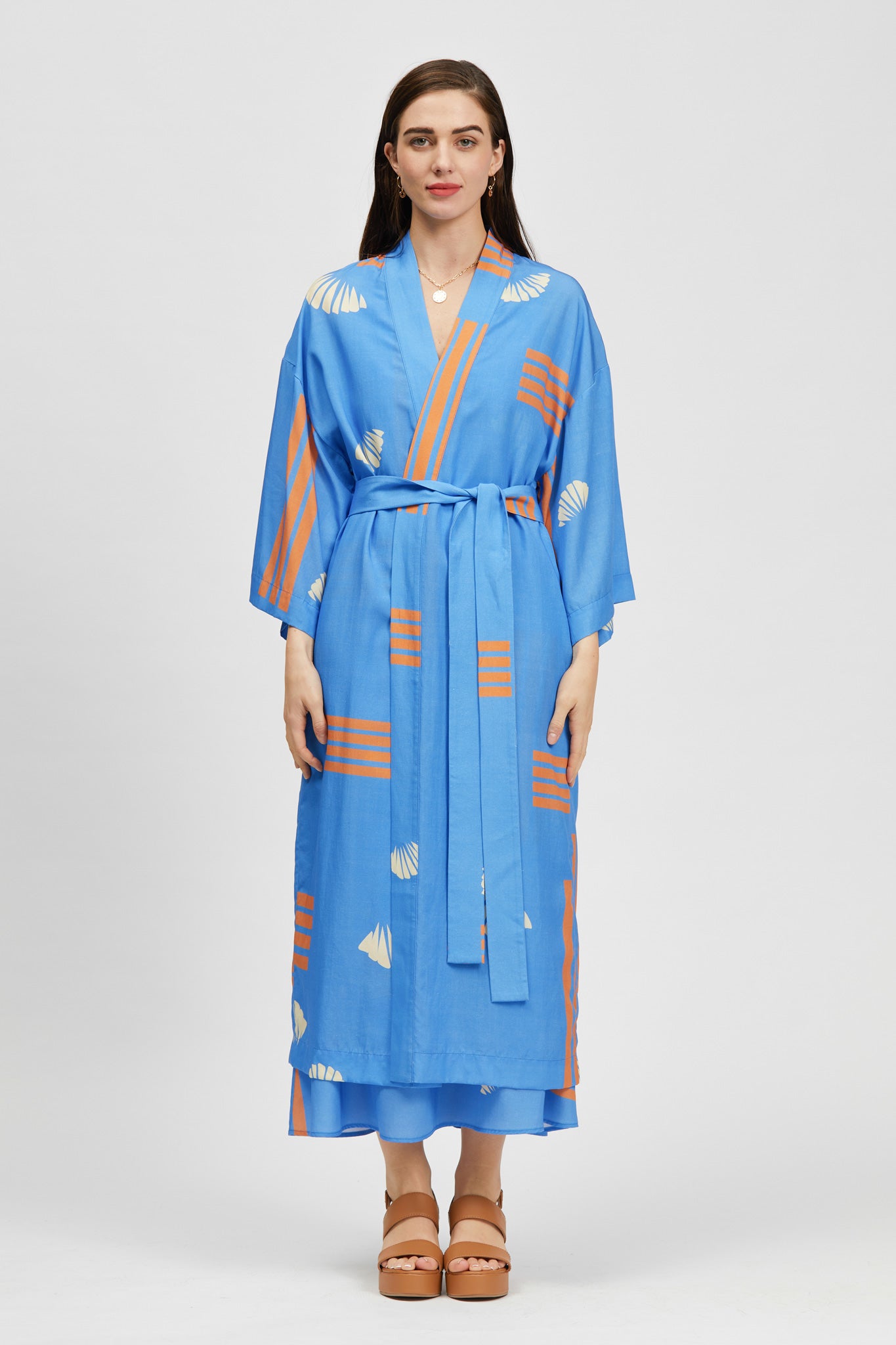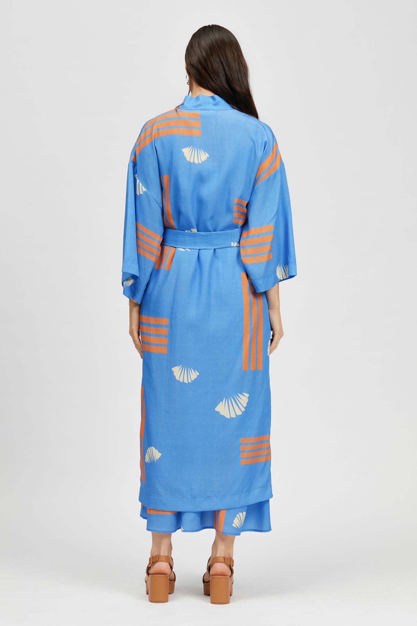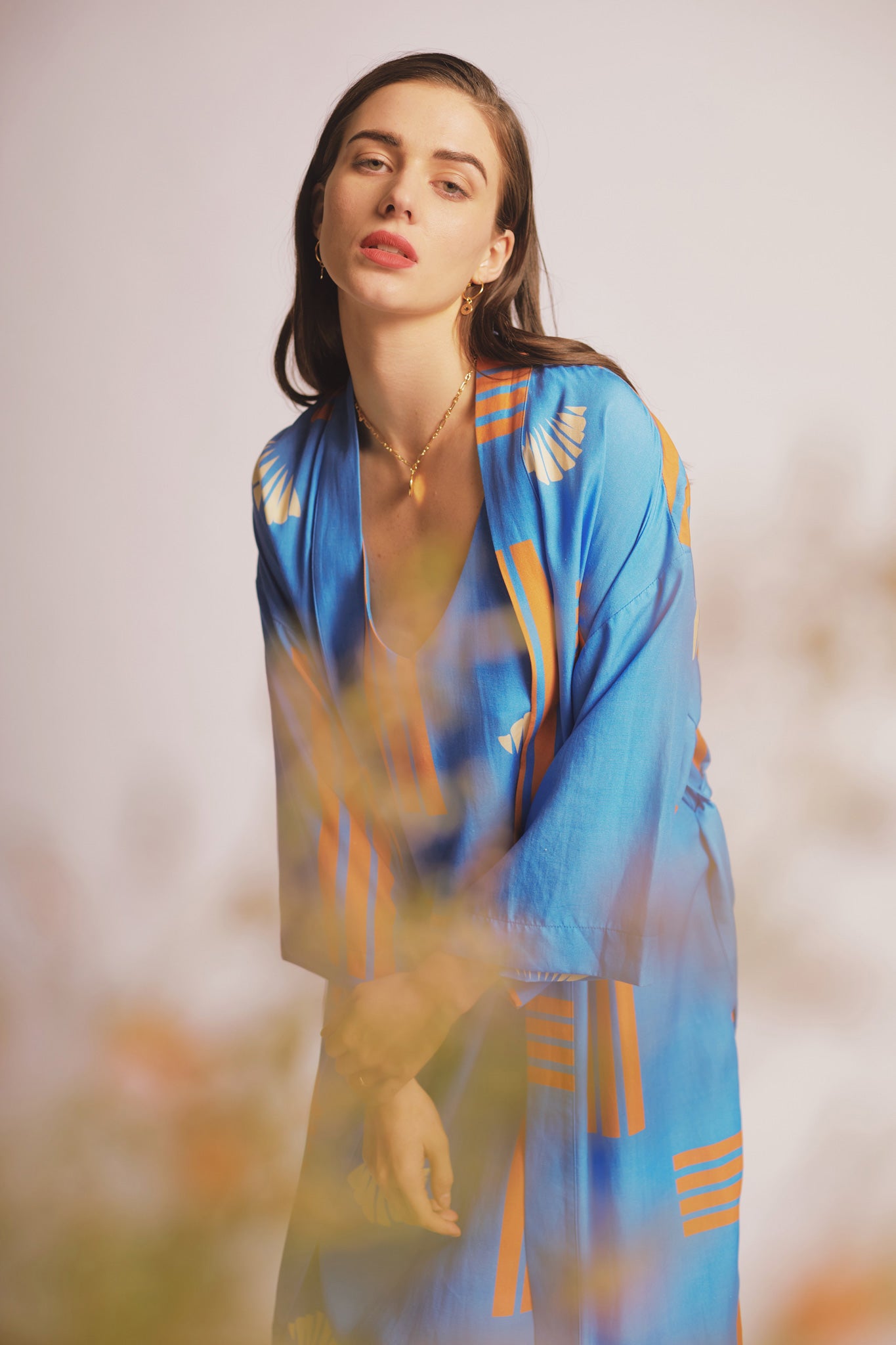 The Sol Robe is a mid-length, wrap style with a relaxed fit and wide sleeves. This style offers a detachable tie-up belt and inseam pockets. Made from a soft tencel blend with búl’s house-designed Concha Print.