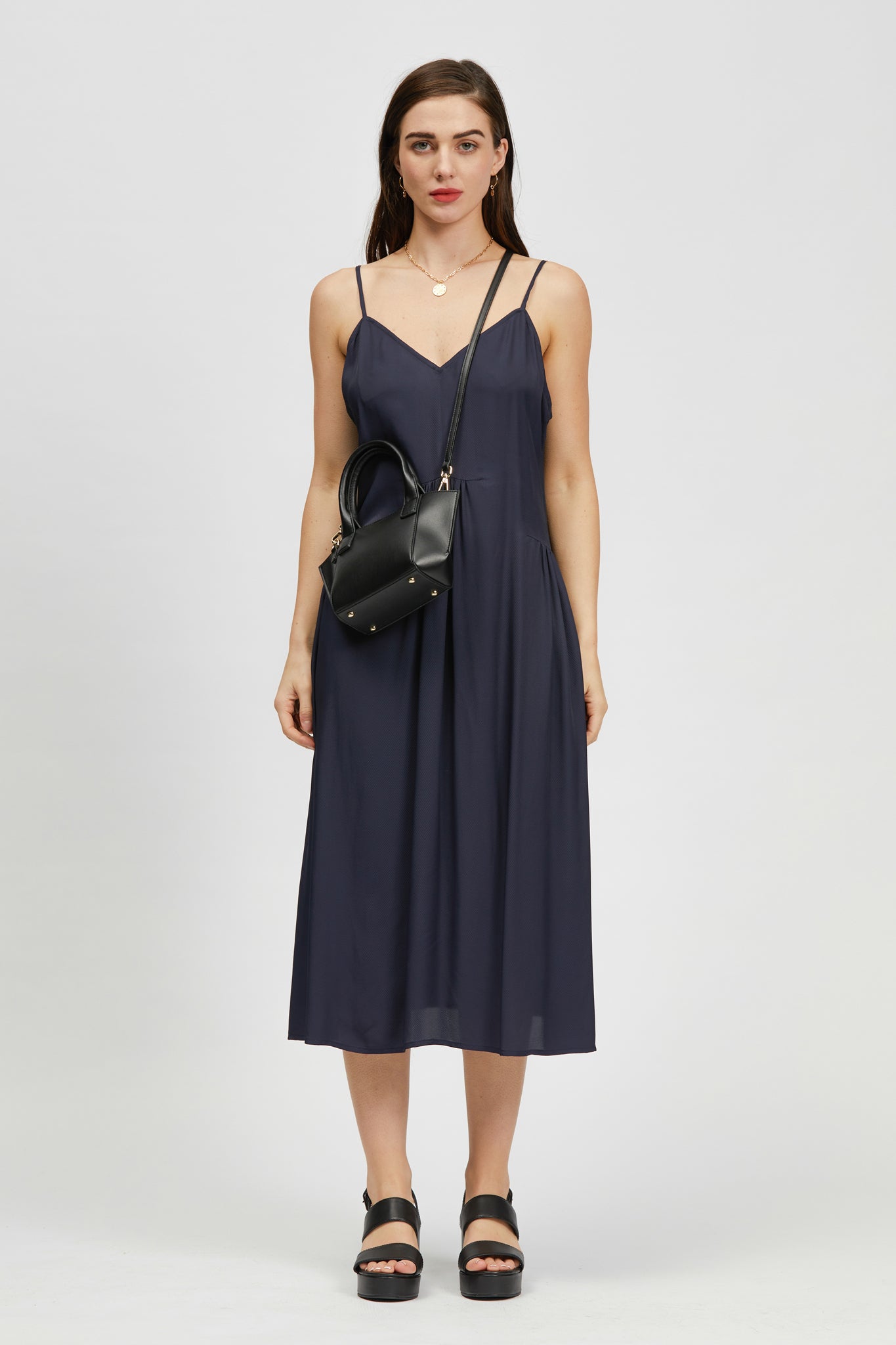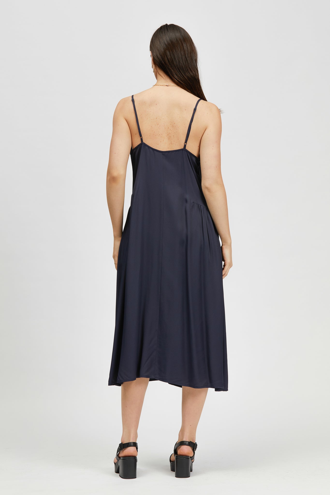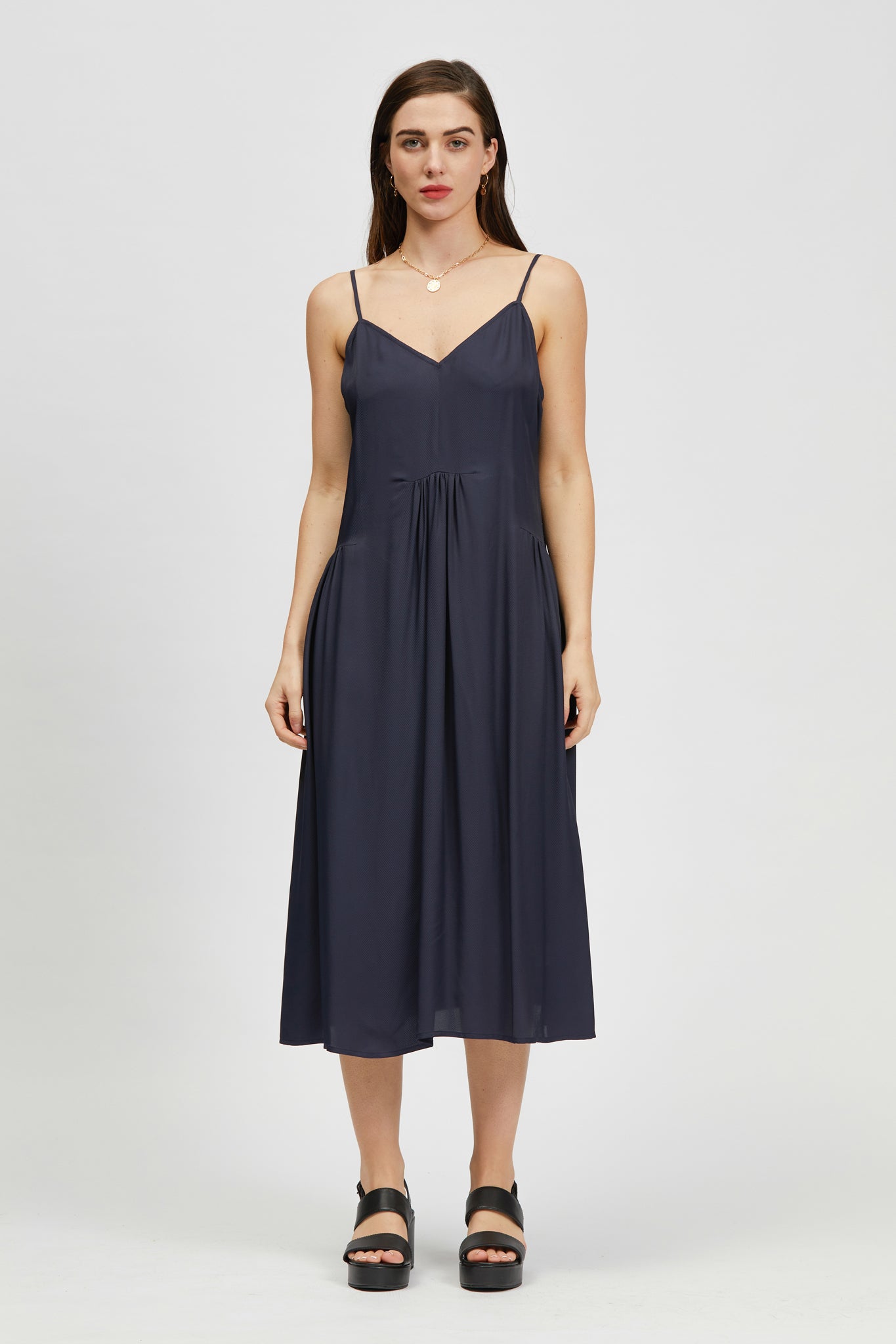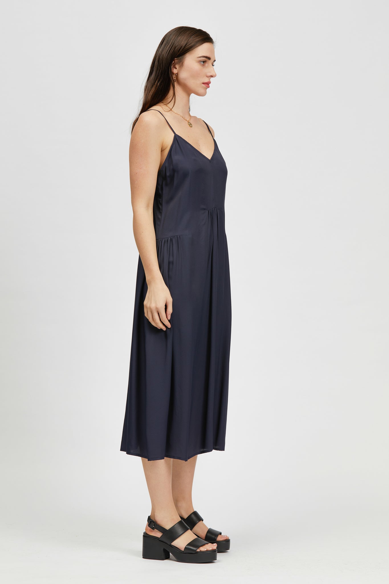 The Adeus Dress is a sleeveless, mid-length, relaxed fit style. This style offers gathered seams creating a soft volume at the waist and hip. Made in a flowy viscose fabrication