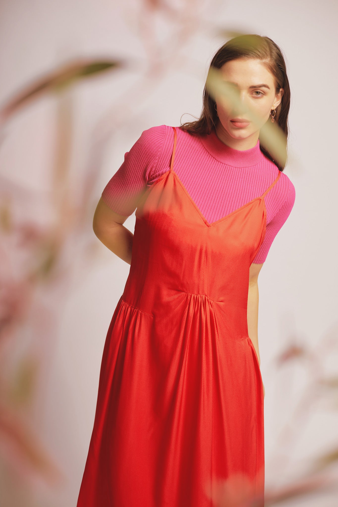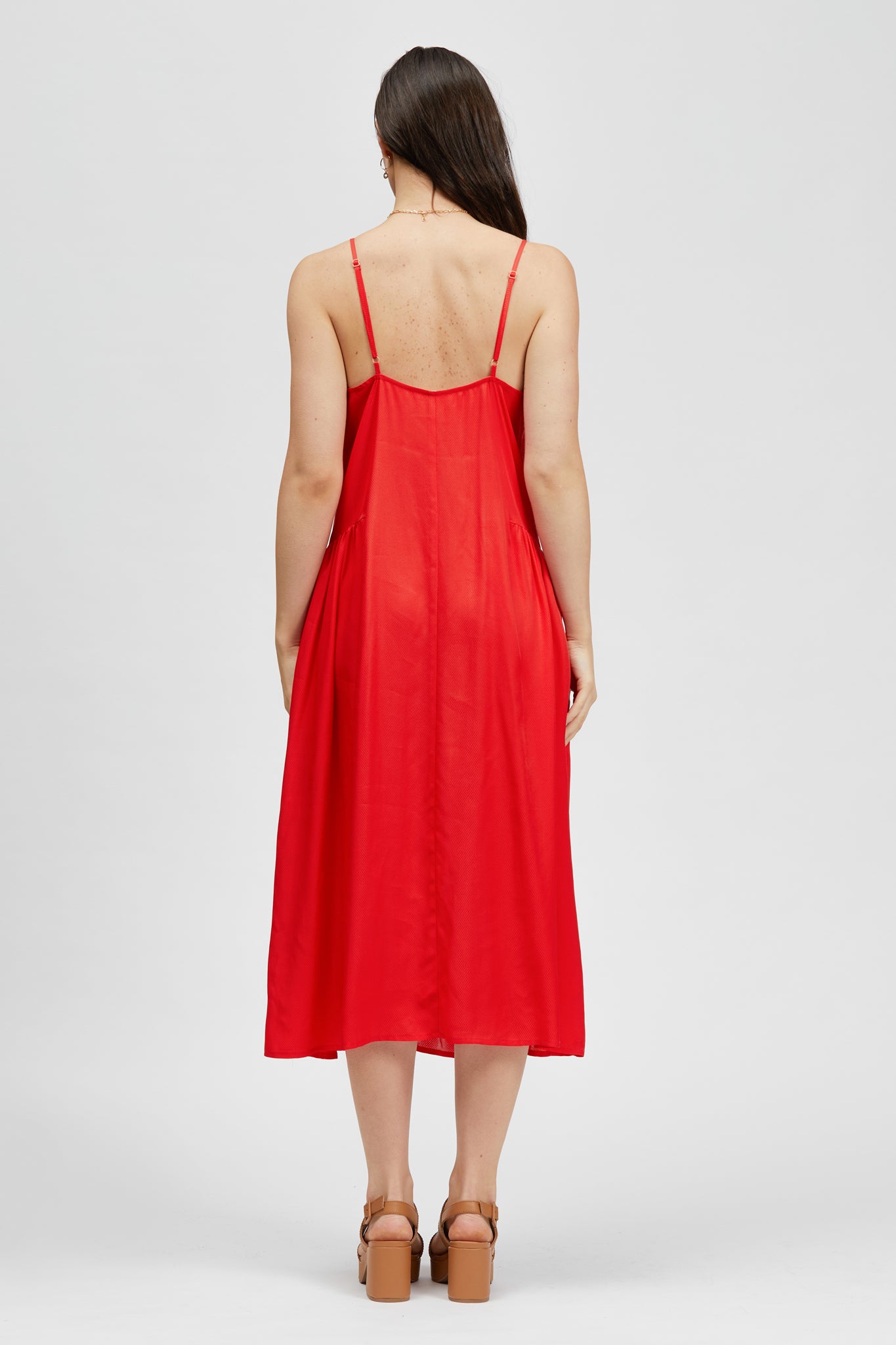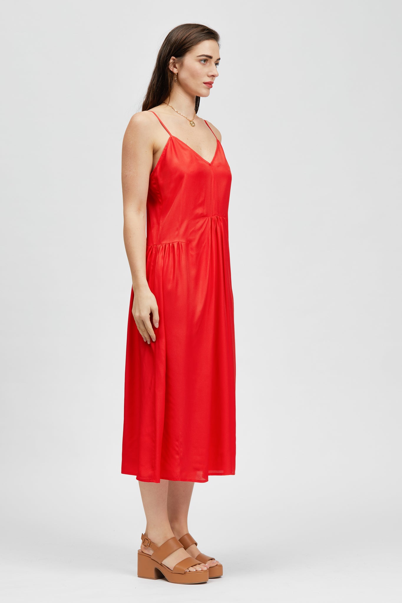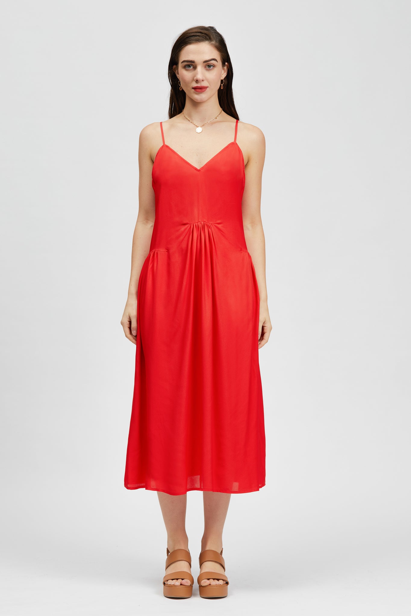 The Adeus Dress is a sleeveless, mid-length, relaxed fit style. This style offers gathered seams creating a soft volume at the waist and hip. Made in a flowy viscose fabrication.