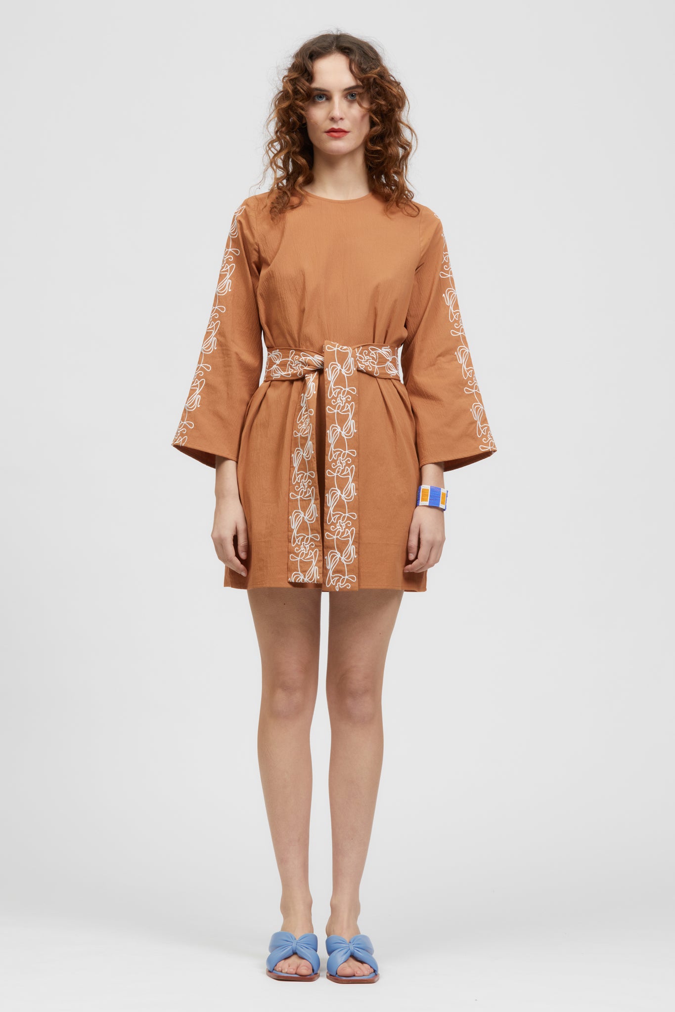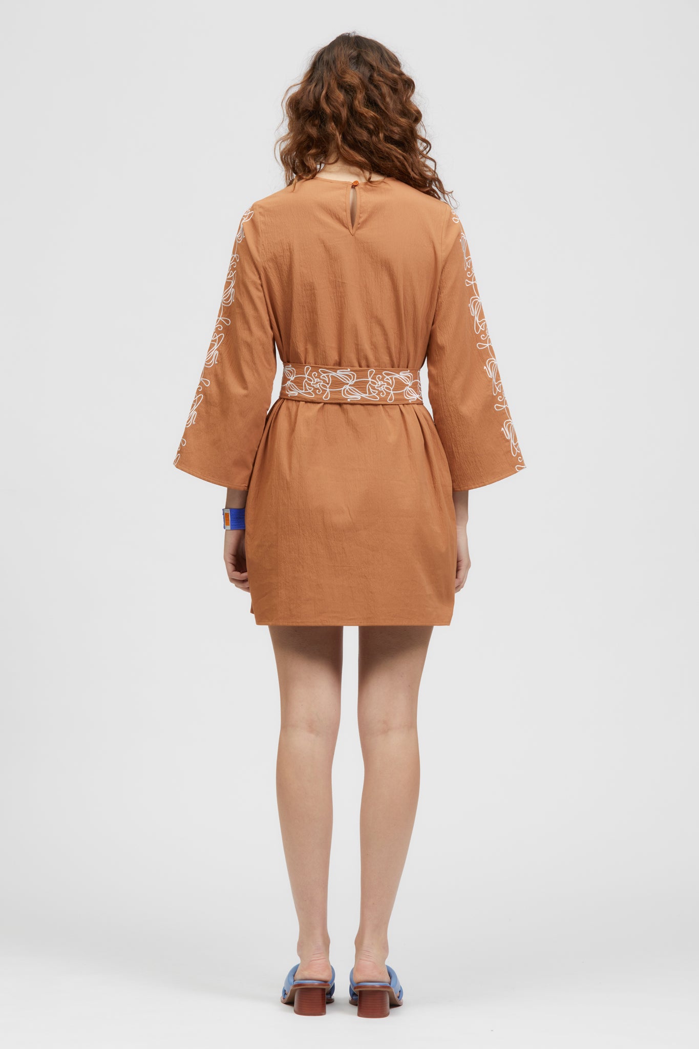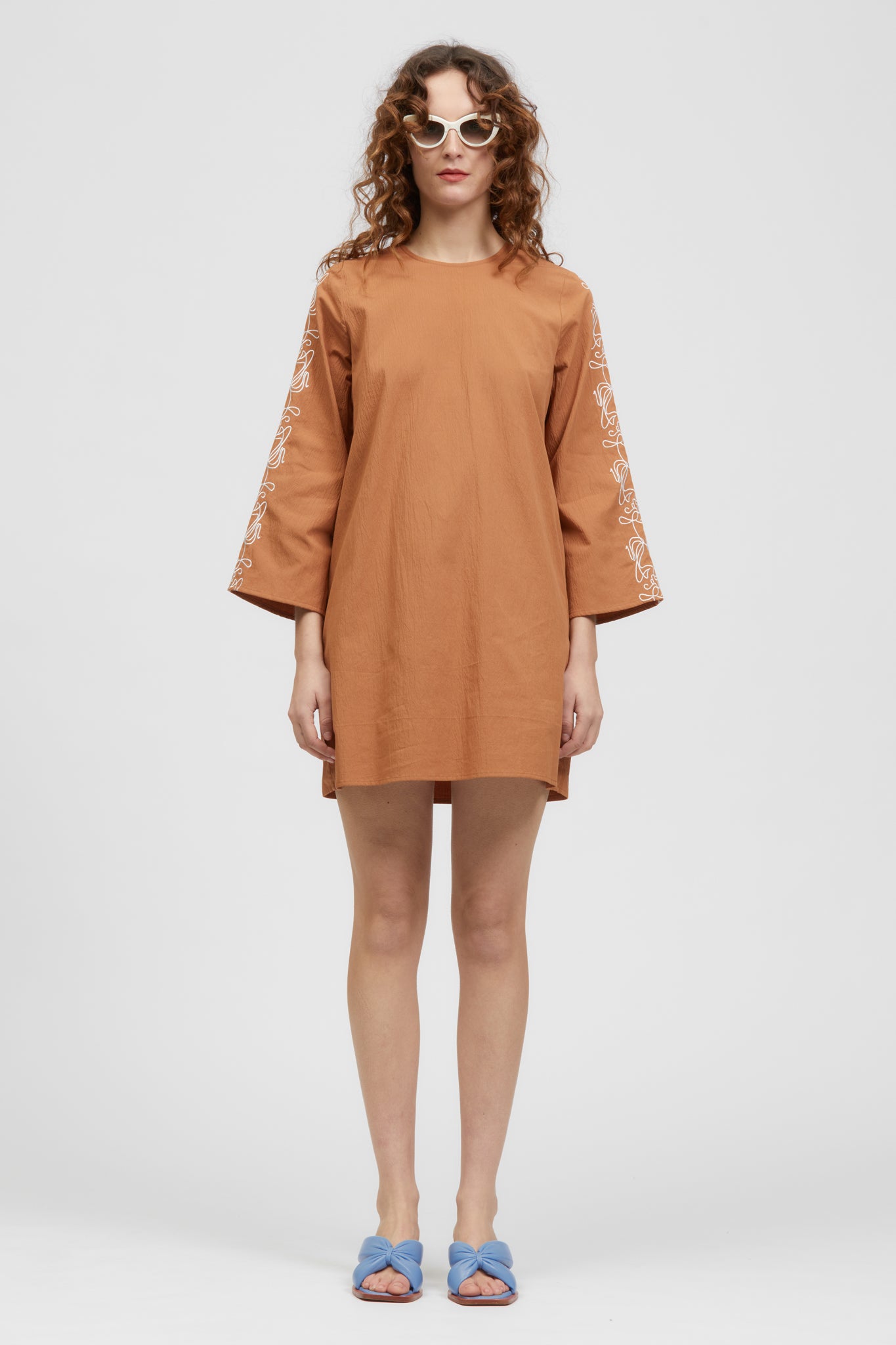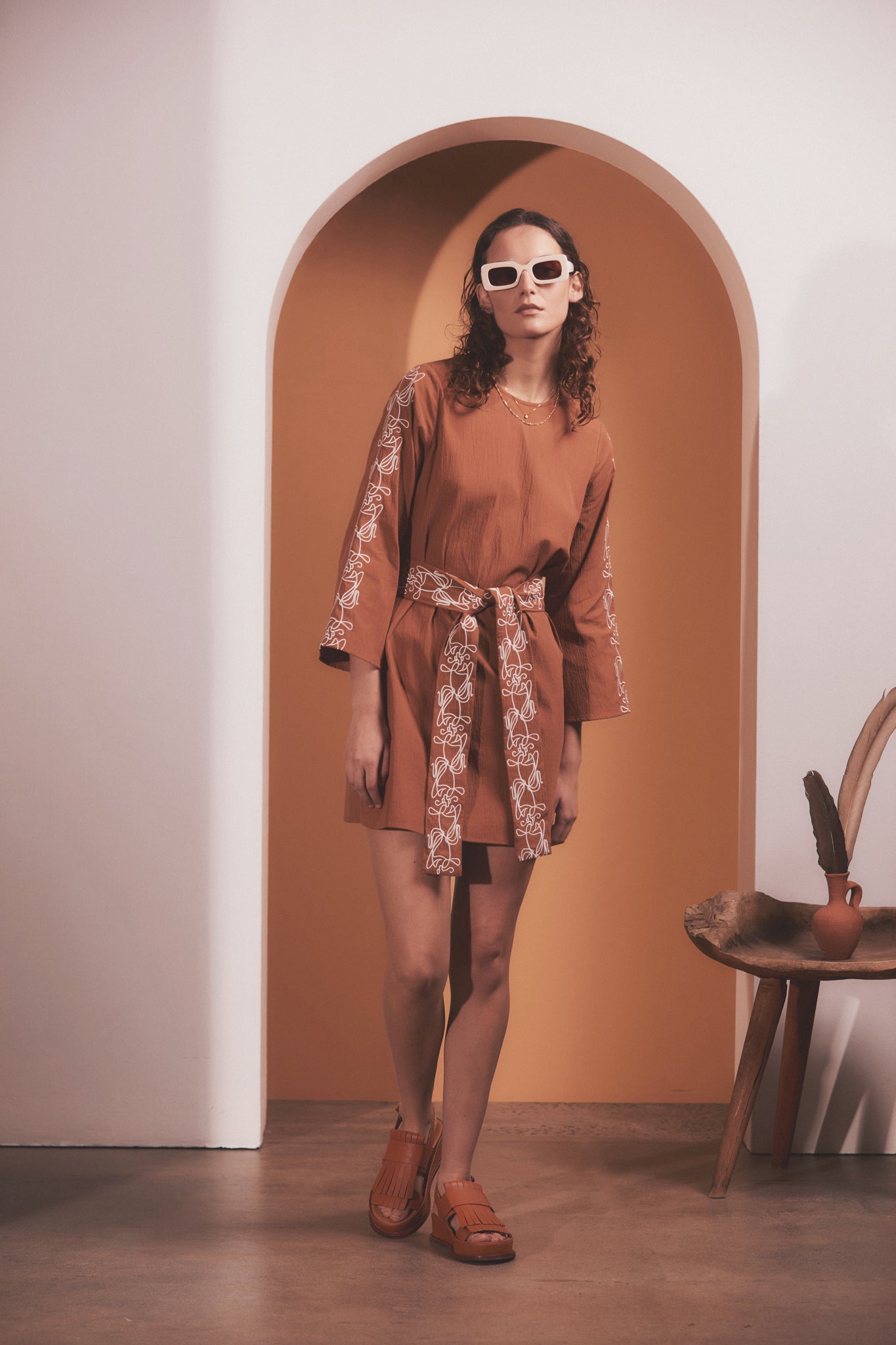 The Amani Dress is a mini-length, relaxed-fit shift dress with bell sleeves. This style includes búl’s house-designed embroidery in a contrasting cream along the lengths of the sleeve as well as along the detachable belt tie, which can bring in the silhouette at the waist if desired. This style has inseam pockets at the side body and a rounded neckline with a slit in the centre back which leads to the back-neck button fastening. Made with a Cotton seersucker fabrication.