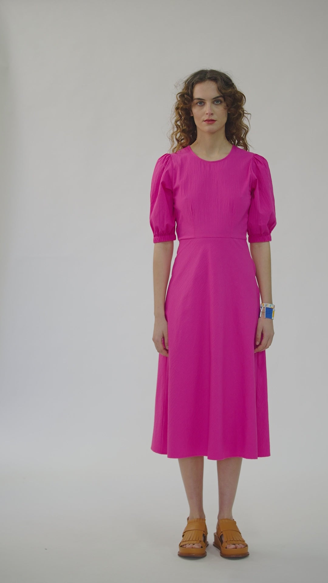 The Leo Midi Dress is a round neckline, mid-length style with a side invisible zip fastening. This style has short sleeves with elasticated cuffs and includes gathering on the shoulder to create a soft volume. The front and back waist darts create a tailored fit around the bodice. The Leo Midi Dress finishes with a flowy hem and is made from Cotton seersucker.