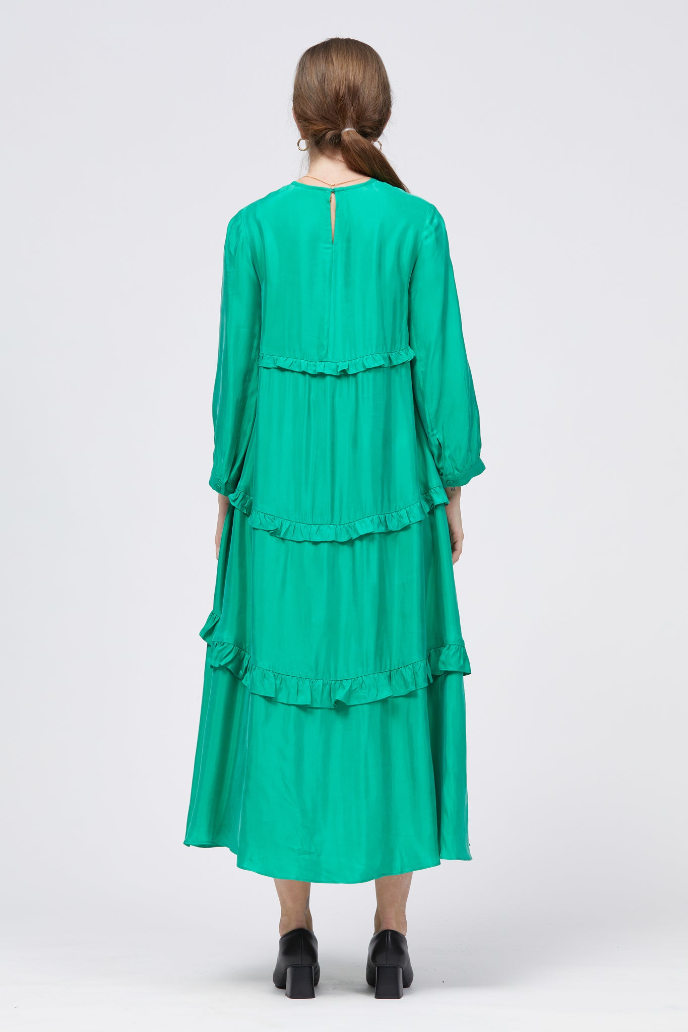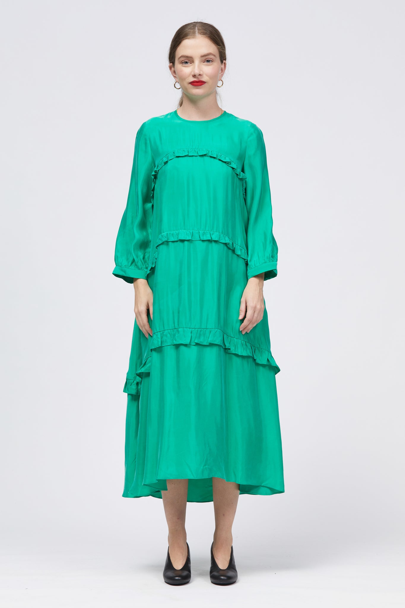 The Nas Dress is a relaxed fit, tiered maxi-length style with ruffle detailing, and gathered mid-length sleeves. Made in a flowy Cupro/Viscose blend.