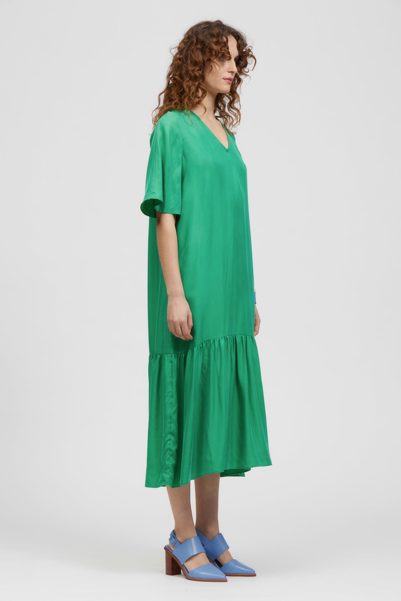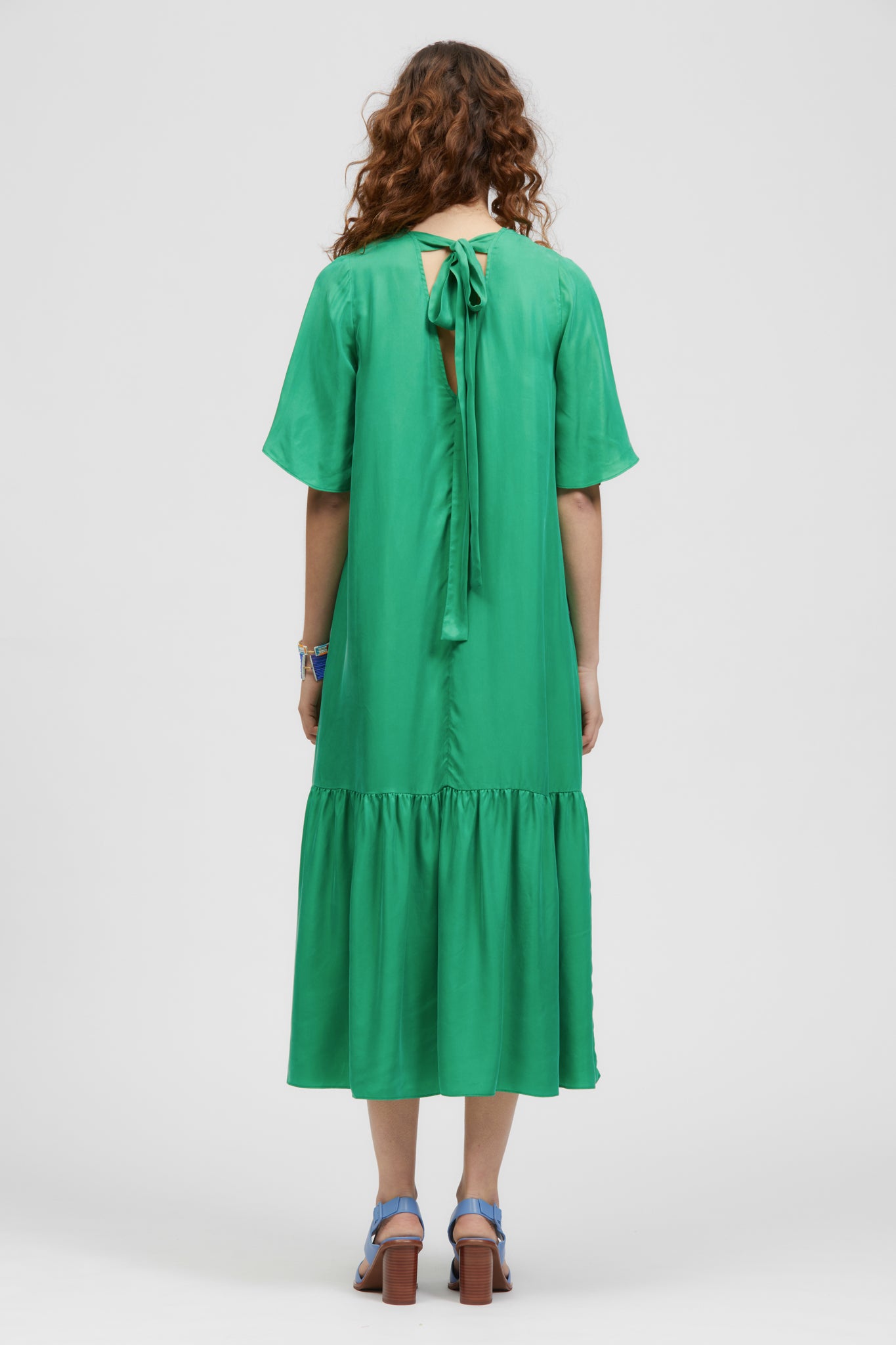 The Rafiki Maxi Dress is a v-neckline, relaxed fit maxi with a lower frill detailing on the skirt adding volume towards the hem. The style has a v-neckline front and lower v-neckline at the back with two long ties for fastening. This style is made with a soft Cupro/Viscose.