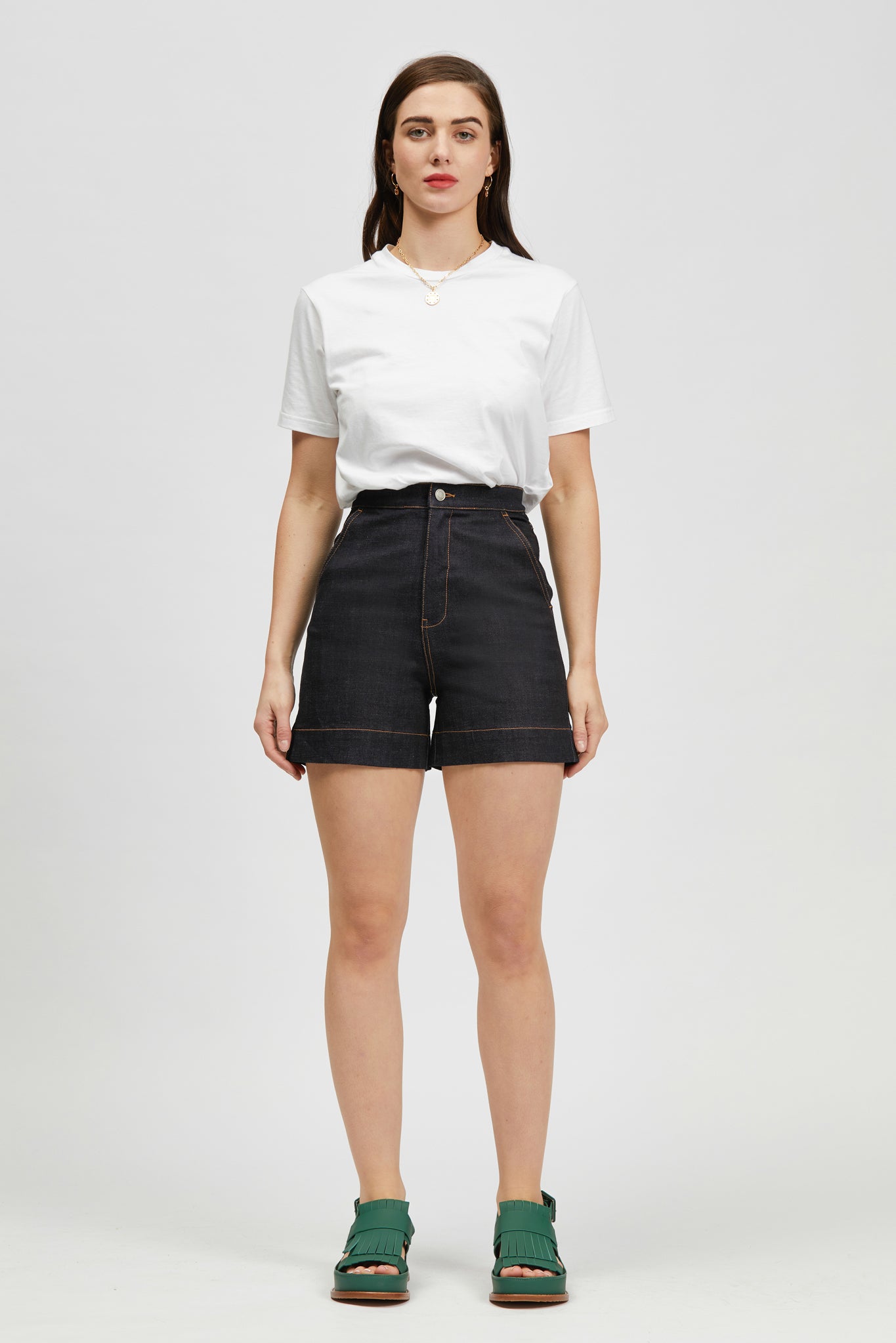The Rembo Short is a high-waisted, mini length, denim short with a regular fit. This style offers contrasting top stitching, front slant pockets and back welt pockets. Made with stretch denim.