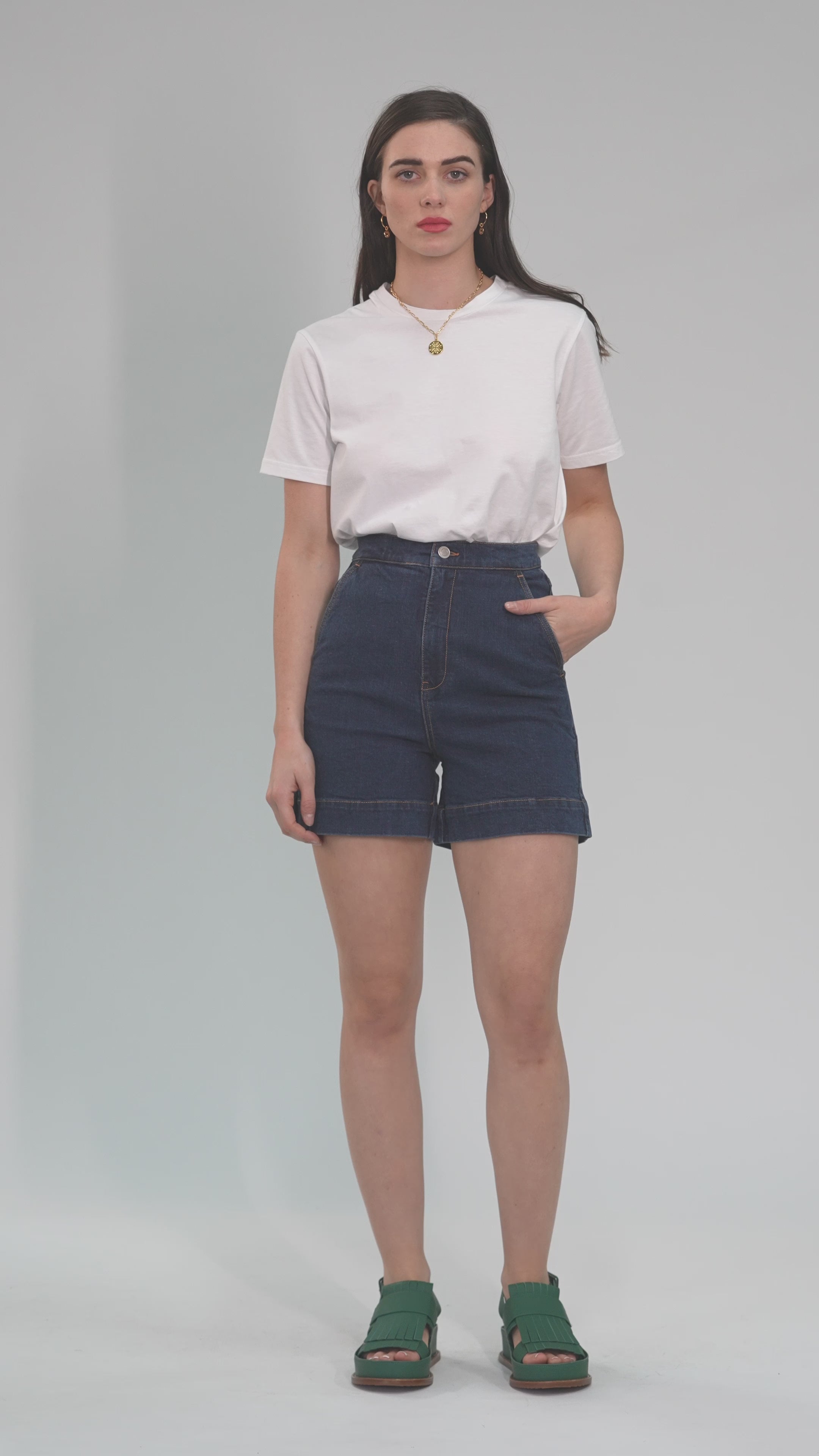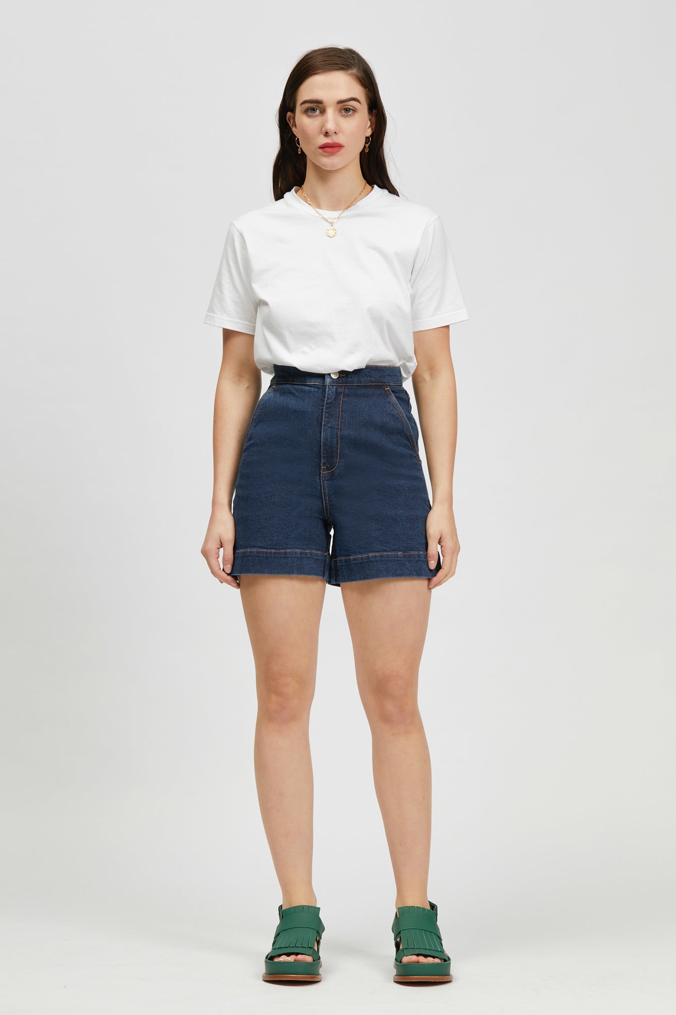 The Rembo Short is a high-waisted, mini length, denim short with a regular fit. This style offers contrasting top stitching, front slant pockets and back welt pockets. Made with stretch denim.