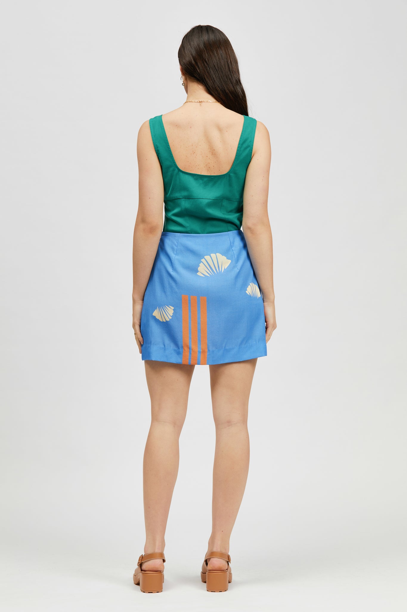 The Boavista Skirt is a high waist, a-line, mini-length style with a regular fit. This style offers pintuck detailing and back darts. Made from a soft tencel blend with búl’s house-designed Concha Print.