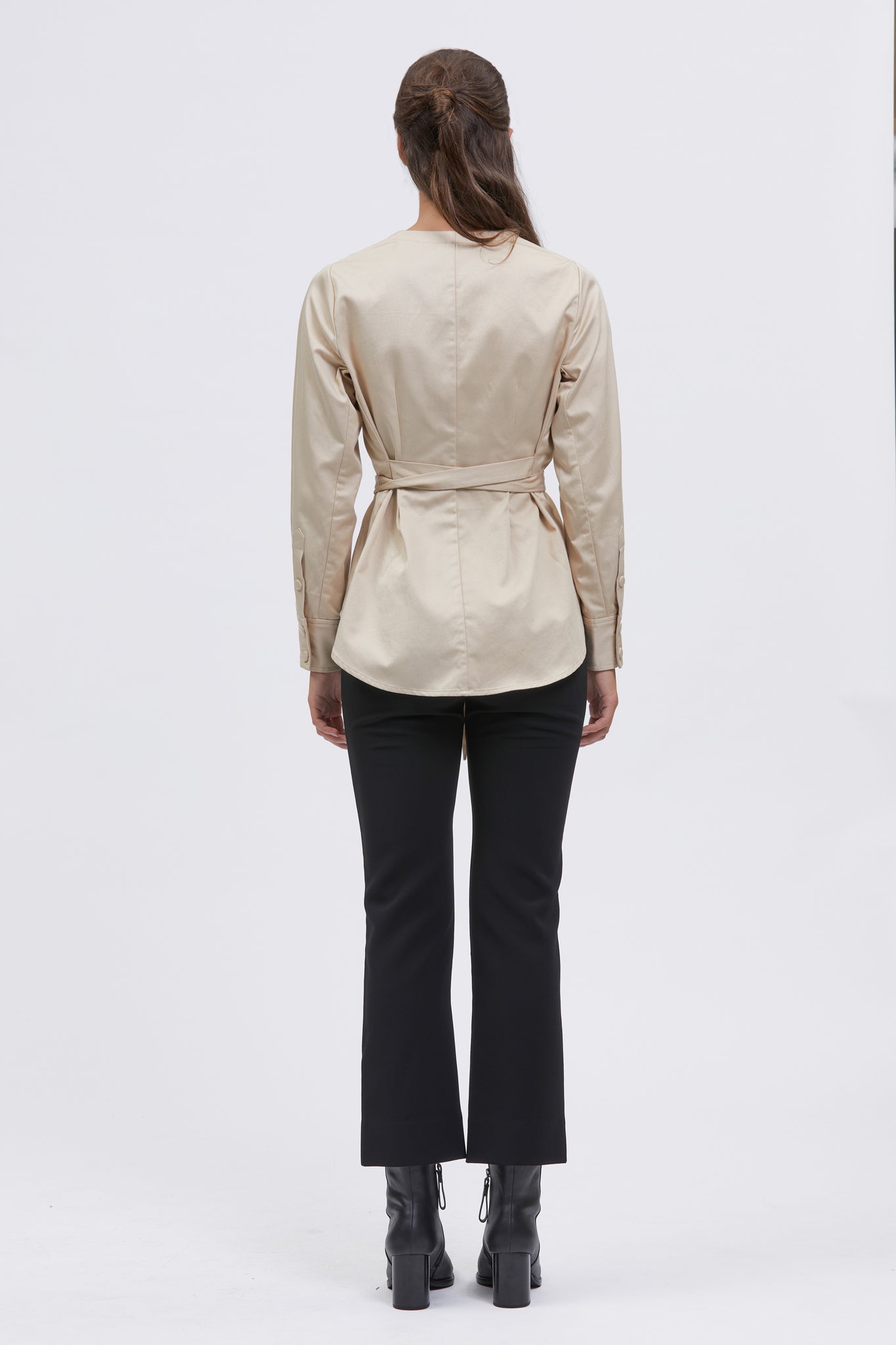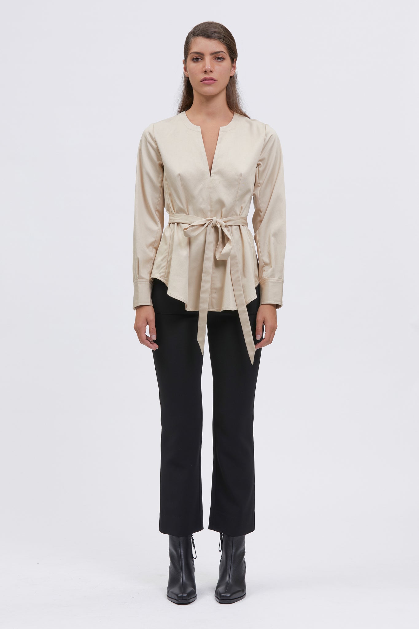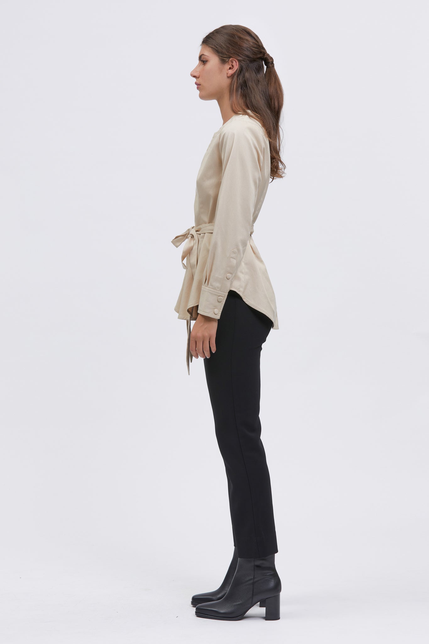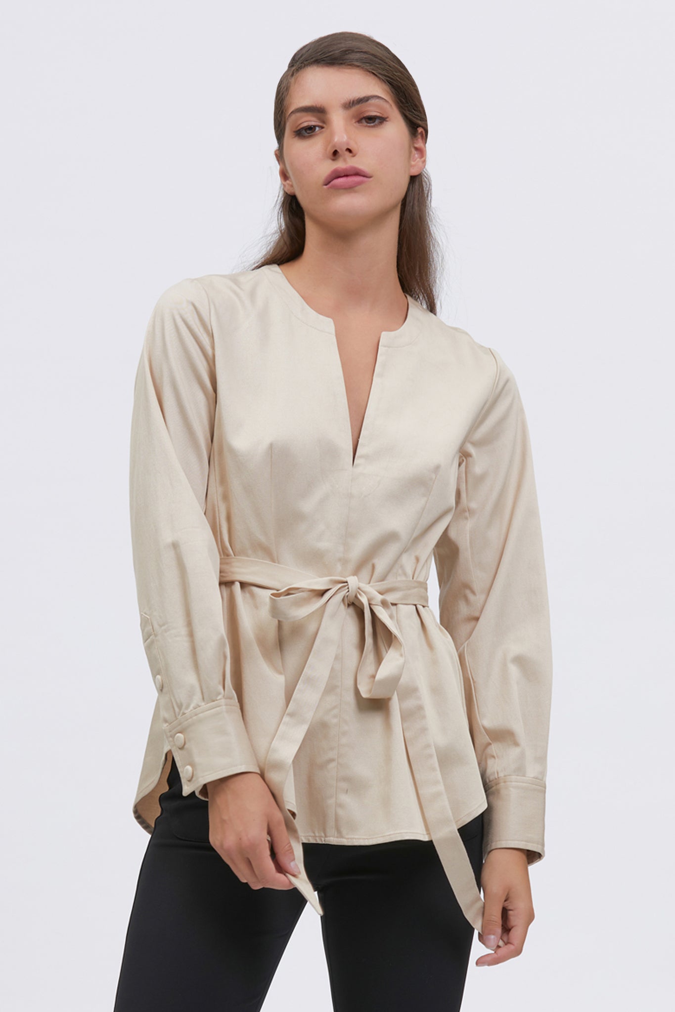 The Adiu Top is a long-sleeved style that has a round neckline with a slit along the centre front, princess lines on the front and back body, and ties attached to both side seams that can be tied at the front or back body. This style has shirting style cuffs that can be fastened with self-covered press buttons.