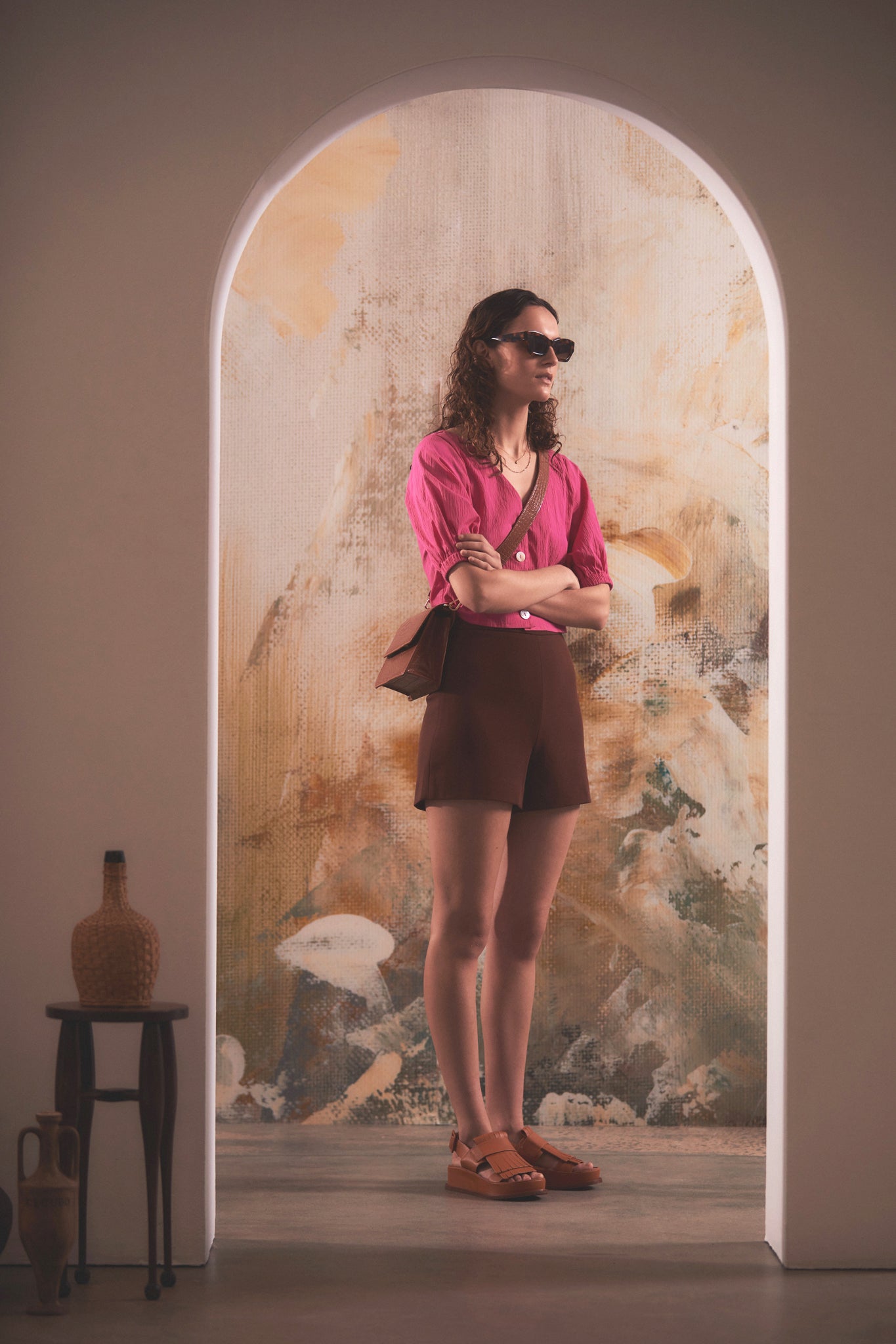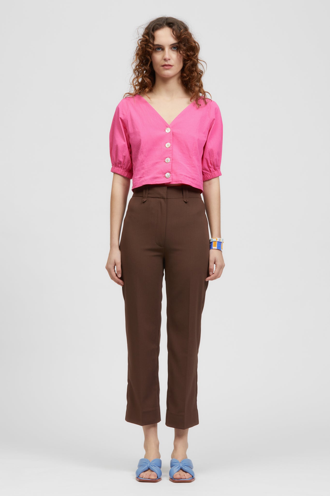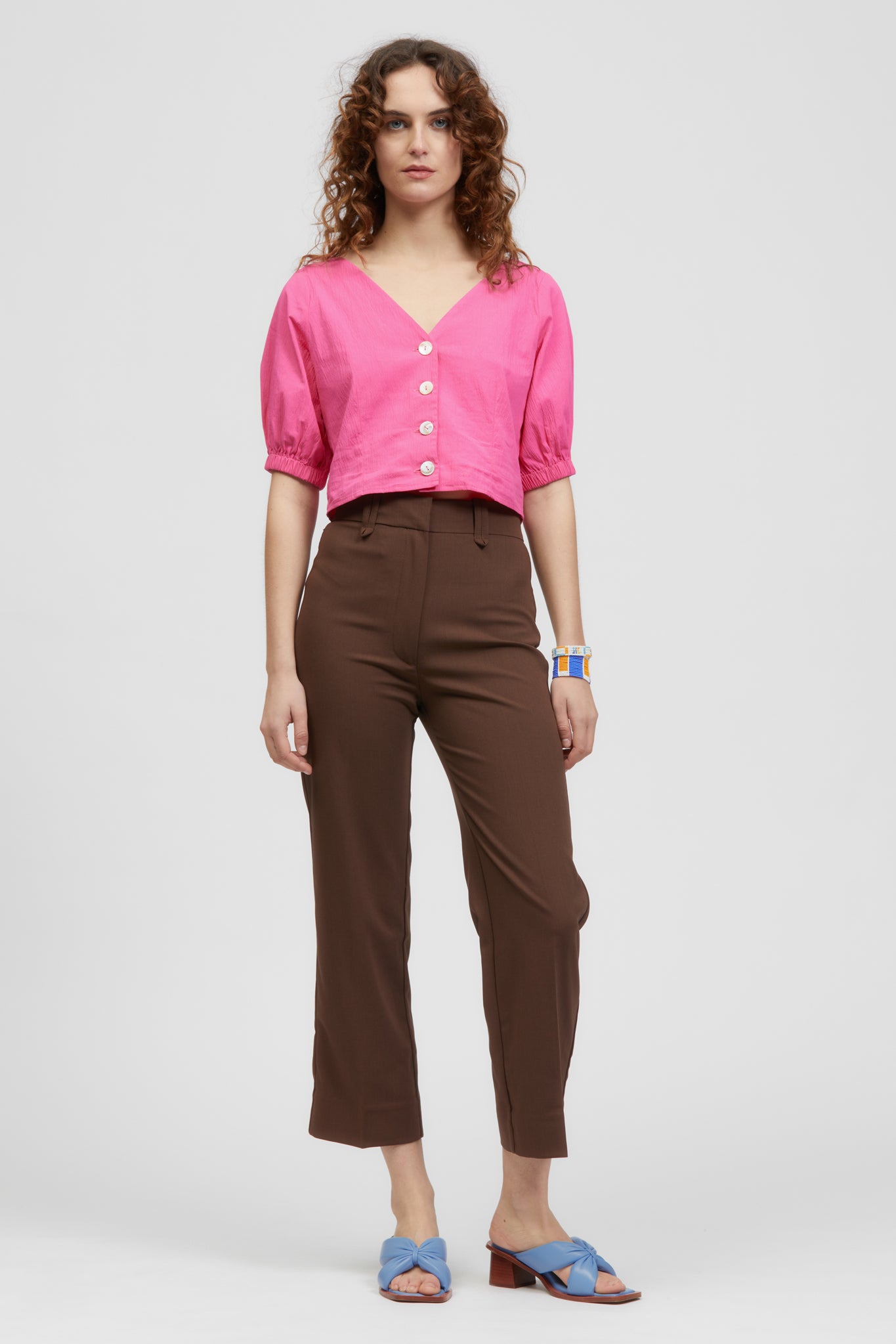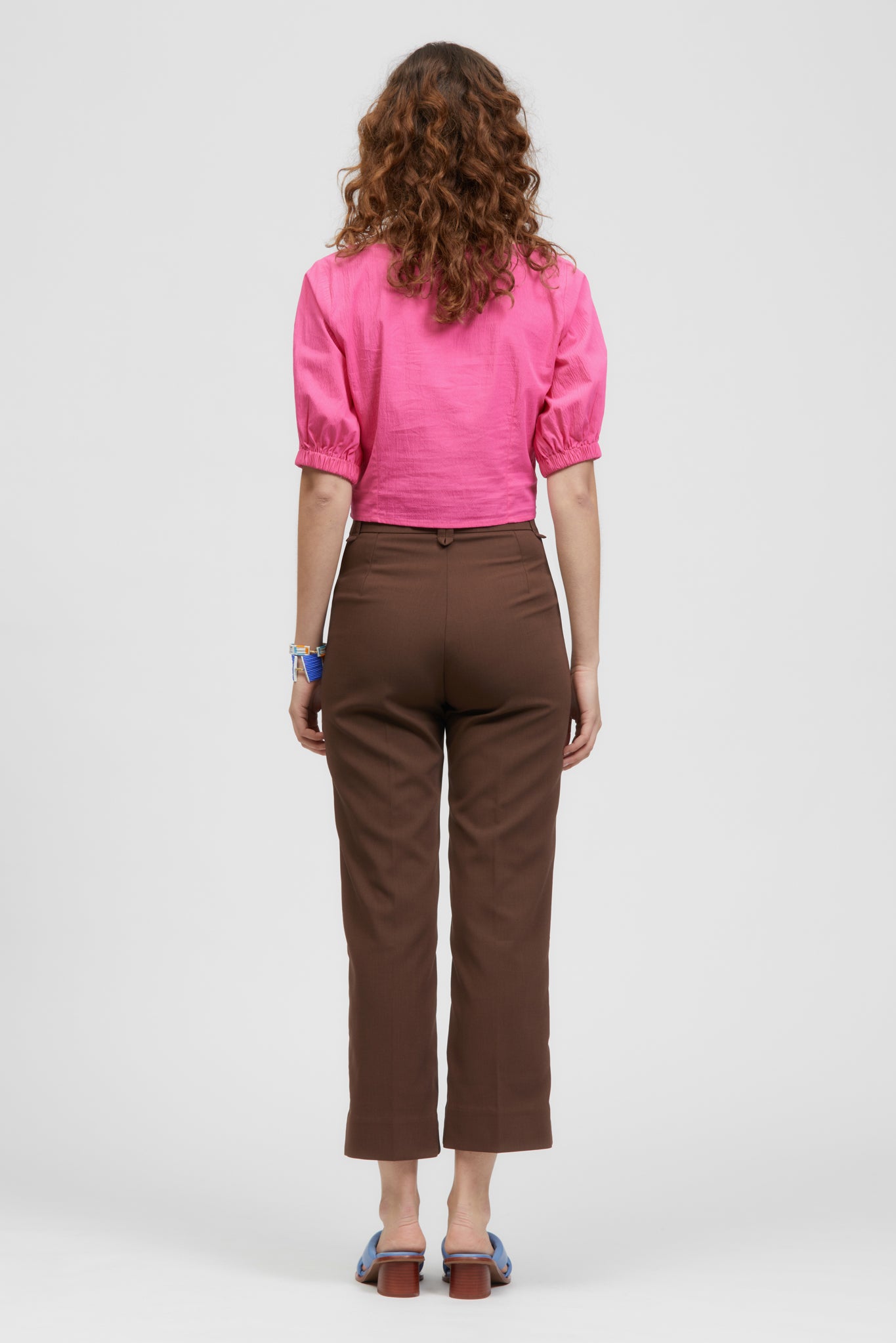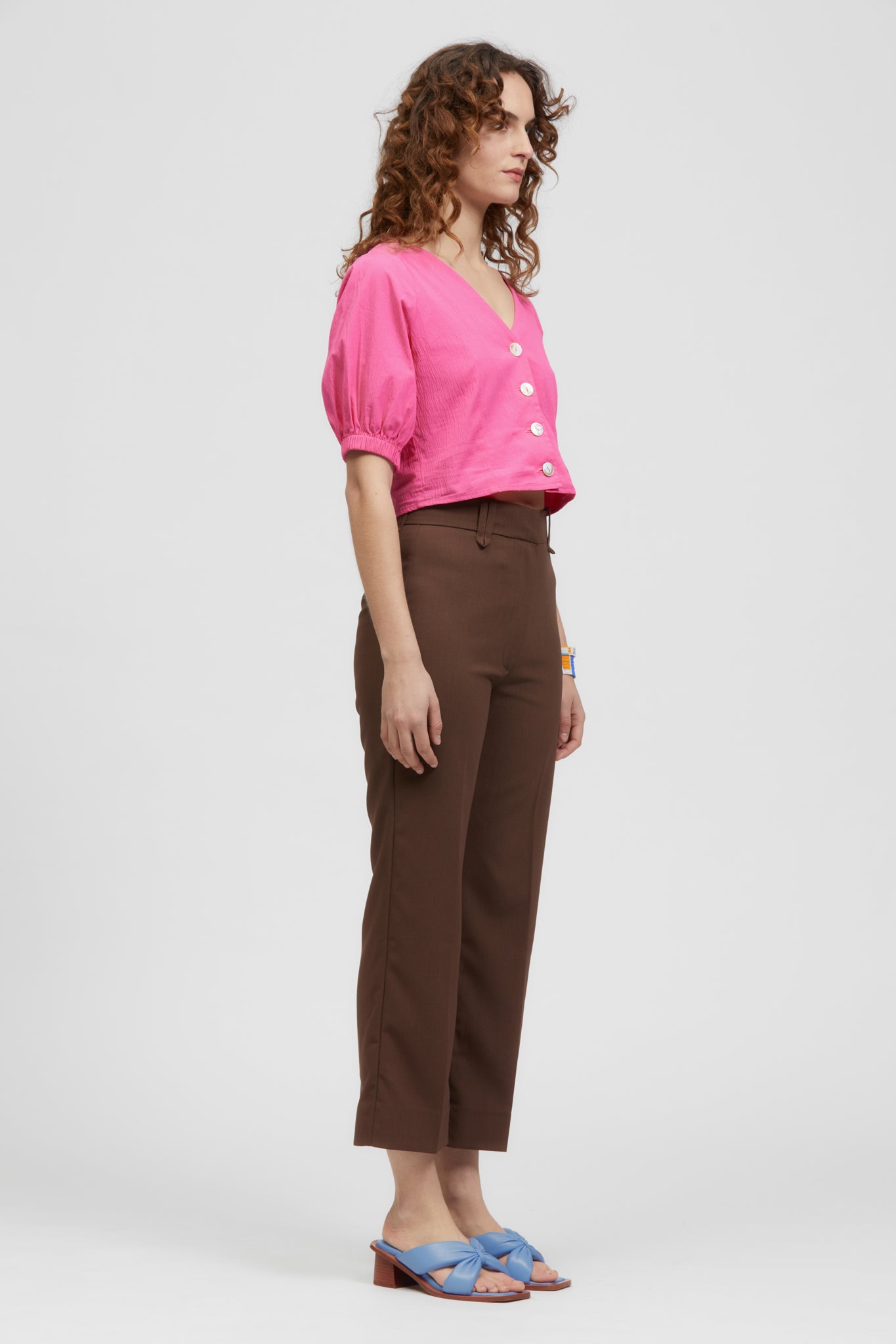 The Gombe Top is a v-neckline style with centre front shell button-up fastenings. This style has short sleeves with elasticated gathered cuffs that create a soft volume. The front and back waist darts offer a tailored fit around the bodice. The Gombe Top finishes on the waist and is made from a Cotton seersucker fabrication.